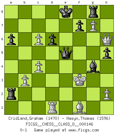 Last move : 0-1 2010 June 14 9:17:42 [Event "FICGS__CHESS__CLASS_D__000146"] [Site "FICGS"] [Date "2010.04.13"] [Round "1"] [White "Cridland,Graham"] [Black "Hasyn,Thomas"] [Result "0-1"] [WhiteElo "1470"] [BlackElo "1596"] 1.e4 c5 2.Nf3 d6 3.d4 cxd4 4.Nxd4 Nf6 5.Nc3 a6 6.Bg5 e6 7.f4 Nbd7 8.Qf3 Qc7 9.O-O-O Be7 10.g4 b5 11.Bxf6 Nxf6 12.g5 Nd7 13.f5 Nc5 14.f6 gxf6 15.gxf6 Bf8 16.Rg1 h5 17.a3 Rb8 18.Rg7 b4 19.axb4 Rxb4 20.Nd5 exd5 21.exd5 Nd7 22.Nc6 Ne5 23.Qe3 Ra4 24.Kb1 Bxg7 25.fxg7 Rg8 26.Qh6 Nxc6 27.dxc6 Qa5 28.c4 Ra1+ 29.Kc2 Qa4+ 30.b3 Ra2+ 31.Kc3 Qa5+ 32.Kd3 Bf5+ 33.Ke3 Qe5+ 34.Kf3 Bg4+ 0-1 Sicilian : Najdorf, 7.f4 Queenside Castling by player White (move 9) Player Black won this chess game. Follow this game move after move (download)In complicated positions, Bobby Fischer hardly had to be afraid of anybody. (Paul Keres) Wenn du auf das Glück wartest, wird das Leben ziemlich langweilig. (Mikhail Nekhemyevich Tal) Los finales de Peón son del Ajedrez lo que el cesped es del Golf. (Cecil Purdy) Les écrivains ont utilisé les échecs pour analyser les côtés extrêmes de la nature humaine. Dans ce cadre, les échecs offrent un champ d'expérimentation idéal. Mais on pourrait faire la même chose avec la peinture. Et là, en vous référant à Van Gogh, vous ne tirerez pas de conclusion définitive sur les peintres. (Gary Kasparov) A shortcut is the longest distance between two points. (Don Groves)