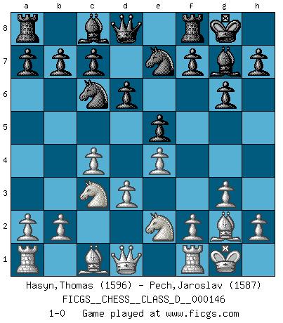 Last move : 1-0 2010 June 15 8:46:12 [Event "FICGS__CHESS__CLASS_D__000146"] [Site "FICGS"] [Date "2010.04.13"] [Round "1"] [White "Hasyn,Thomas"] [Black "Pech,Jaroslav"] [Result "1-0"] [WhiteElo "1596"] [BlackElo "1587"] 1.c4 e5 2.g3 Nc6 3.Bg2 g6 4.Nc3 Bg7 5.e4 d6 6.Nge2 Nge7 7.d3 O-O 8.O-O 1-0 This chess game has been lost on time (started : 2010.04.13 7:39:48) English Opening Kingside Castling by player Black (move 7) Kingside Castling by player White (move 8) Player White won this chess game. Follow this game move after move (download)That's what Chess is all about. One day you give your opponent a lesson, the next day he gives you one. (Bobby Fischer) Moralische Siege zählen nicht. (Savielly Grigorievitsch Tartakower) Tu cuerpo tiene que estar en óptima condición. Tu Ajedrez se deteriora como lo hace tu cuerpo. No puedes separar la mente y el cuerpo. (Bobby Fischer) Nous vivons dans un monde échiquéen : chaque jour qui passe est un défi à relever. (Philosophe Sasha) Tomorrow's what you make of it. (Horatio Caine, C.S.I. Miami)
