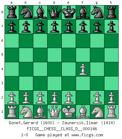 Last move : 1-0 2010 May 26 8:38:15 [Event "FICGS__CHESS__CLASS_D__000146"] [Site "FICGS"] [Date "2010.04.13"] [Round "1"] [White "Gonet,Gerard"] [Black "Zaunercik,Ilmar"] [Result "1-0"] [WhiteElo "1600"] [BlackElo "1414"] 1.f4 1-0 This chess game has been lost on time (started : 2010.04.13 7:39:48) Bird's Opening Player White won this chess game. Follow this game move after move (download)Bobby is the most misunderstood, misquoted celebrity walking the face of this earth. (Yasser Seirawan) Zeige mir drei Eröffnungsvarianten und ich beweise dir, dass zwei davon inkorrekt sind. (Emanuel Lasker) Después de una mala apertura, hay una esperanza en el juego medio. Pero una vez que estas en finales, el momento de la verdad ha llegado. (Edmar Mednis) Les réformistes prétendent que les progrès de la théorie conduiront à la disparition des échecs, et qu'il faut, pour leur rendre vie, en remanier les règles. En réalité, qu'exprime cette affirmation? Le mépris de l'intuition, de l'imagination et de tous les autres éléments qui font des échecs un art. (Alexander Alekhine) There will be no order, only chaos. (Sol Robeson in Pi by Darren Aronofsky)