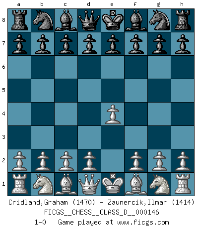 Last move : 1-0 2010 May 26 8:38:15 [Event "FICGS__CHESS__CLASS_D__000146"] [Site "FICGS"] [Date "2010.04.13"] [Round "1"] [White "Cridland,Graham"] [Black "Zaunercik,Ilmar"] [Result "1-0"] [WhiteElo "1470"] [BlackElo "1414"] 1.e4 1-0 This chess game has been lost on time (started : 2010.04.13 7:39:48) King's pawn Opening Player White won this chess game. Follow this game move after move (download)Chess is like life. (Boris Spassky) Warum muß ich gegen diesen IDIOTEN verlieren? (Aaron Nimzowitsch) El Ajedrez te enseña a controlarl la excitación inicial que sientes cuando vez algo que parece bueno y te enseña a pensar objetivamente cuando te encuentras en problemas. (Stanley Kubrick) On entre au jeu d'Echecs comme on entre en Religion. Pour le joueur d'Echecs, la partie d'Echecs c'est l'office, la messe, le défilé du 1er Mai, le dépôt de gerbe au Monument aux Morts. C'est un drame sacré. (Michel Roos) See no evil, hear no evil, speak no evil. (The 3 monkeys)