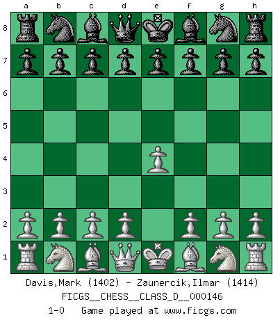 Last move : 1-0 2010 May 26 20:37:18 [Event "FICGS__CHESS__CLASS_D__000146"] [Site "FICGS"] [Date "2010.04.13"] [Round "1"] [White "Davis,Mark"] [Black "Zaunercik,Ilmar"] [Result "1-0"] [WhiteElo "1402"] [BlackElo "1414"] 1.e4 1-0 This chess game has been lost on time (started : 2010.04.13 7:39:48) King's pawn Opening Player White won this chess game. Follow this game move after move (download)It is difficult to play against Einstein's theory --on his first loss to Fischer. (Mikhail Tal) Ich hatte meine größten Erfolge, als ich 47 Jahre alt war. Kasparow war noch nicht mal 42 und hat das Schach schon im Stich gelassen. (Viktor Kortschnoi) Por la belleza de sus partidas, la claridad de su juego y lo brillante de sus ideas, Fischer se creó el mismo como un artista de la misma estatura como Brahms, Rembrandt y Shakespeare. (David Levy) Les sacrifices démontrent seulement que quelqu'un a gaffé. (Savielly Tartacover) The Movers & Shakers of this world are those who play chess in the mornings and go to the disco in the evenings. (Dinesh De Silva)