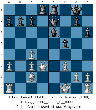 Last move : 0-1 2006 July 19 2:16:44 [Event "FICGS__CHESS__CLASS_C__000002"] [Site "FICGS"] [Date "2006.04.26"] [Round "1"] [White "Arteau,Benoit"] [Black "Wyborn,Graham"] [Result "0-1"] [WhiteElo "1700"] [BlackElo "1700"] 1.d4 d5 2.c4 e6 3.Nc3 Nf6 4.Nf3 Be7 5.Bg5 h6 6.Bxf6 Bxf6 7.e4 dxe4 8.Nxe4 Be7 9.a3 O-O 10.Bd3 f5 11.Ng3 Nc6 12.Bc2 Bf6 13.Ne2 e5 14.dxe5 Nxe5 15.Nxe5 Bxe5 16.Nc3 Bxc3+ 17.bxc3 Qf6 18.Qd4 Re8+ 19.Kf1 Qe7 20.Qd3 Be6 21.f3 Rad8 0-1 QGD : 4.Nf3 Kingside Castling by player Black (move 9) Player Black won this chess game. Follow this game move after move (download)All I want to do, ever, is just play Chess. (Bobby Fischer) Ein typischer, sehr verbreiteter Gedankenschädling ist der, daß der betreffende Amateur von der Annanhme ausgeht, daß jeder einzelne Zug etwas zu leisten habe. (Aaron Nimzowitsch) El hombre es un frívolo, una creatura engañosa y como un jugador de Ajedrez, se preocupa mas por el proceso de obtener su meta que de la meta por sí misma. (Dostoyevsky) J'ai vu le vaincu d'Echecs jouer des années durant dans l'espoir de la fête de la victoire. Car tu es plus riche de ce qu'elle existe si même elle n'est point pour toi. Ainsi de la perle du fond des mers. (Antoine de Saint-Exupéry) There are 10 types of people in this world: those who understand binary and those who don't. (Anonymous)