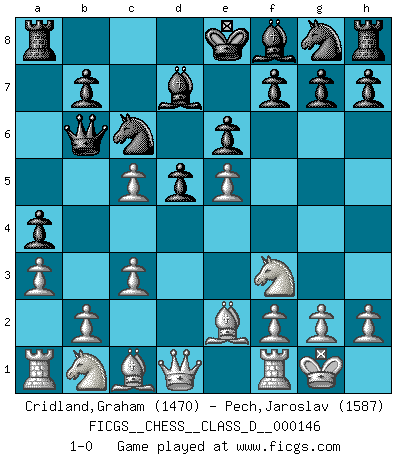 Last move : 1-0 2010 May 29 8:44:45 [Event "FICGS__CHESS__CLASS_D__000146"] [Site "FICGS"] [Date "2010.04.13"] [Round "1"] [White "Cridland,Graham"] [Black "Pech,Jaroslav"] [Result "1-0"] [WhiteElo "1470"] [BlackElo "1587"] 1.e4 e6 2.Nf3 d5 3.e5 c5 4.c3 Nc6 5.d4 Qb6 6.a3 a5 7.Be2 Bd7 8.O-O a4 9.dxc5 1-0 This chess game has been lost on time (started : 2010.04.13 7:39:48) French defense Kingside Castling by player White (move 8) Player White won this chess game. Follow this game move after move (download)Who is your opponent tonight, tonight I am playing against the Black pieces. (Akiba Rubinstein) Jeder weiß, dass Gasprom Putins persönliches Machtinstrument ist. Die Firma wird vom Kreml aus geleitet und wird schon deshalb nie transparent sein. (Garry Kasparov) Los finales de Peón son del Ajedrez lo que el cesped es del Golf. (Cecil Purdy) Je menace de comprendre la position. (Anonyme) A bird doesn't sing because it has an answer, it sings because it has a song. (Maya Angelou)