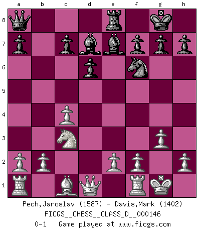 Last move : 0-1 2010 June 27 22:18:29 [Event "FICGS__CHESS__CLASS_D__000146"] [Site "FICGS"] [Date "2010.04.13"] [Round "1"] [White "Pech,Jaroslav"] [Black "Davis,Mark"] [Result "0-1"] [WhiteElo "1587"] [BlackElo "1402"] 1.c4 e5 2.Nc3 Nc6 3.Nf3 Nf6 4.g3 Be7 5.Bg2 O-O 6.O-O d6 7.d4 exd4 8.Nxd4 Re8 9.Nxc6 bxc6 10.Bxc6 Bd7 11.Bxa8 Qxa8 0-1 English : Four knights, kingside Fianchetto Kingside Castling by player Black (move 5) Kingside Castling by player White (move 6) Player Black won this chess game. Follow this game move after move (download)Suddenly it was obvious to me in my analysis I had missed what Fischer had found with the greatest of ease at the board. (Mikhail Botvinnik) Ein Isolani verdüstert die Stimmung auf dem ganzen Schachbrett. (Savielly Grigorievitsch Tartakower) No hay un Gran Maestro de Ajedrez que sea normal; solo se diferencían ellos por la magnitud de su locura. (Viktor Korchnoi) Le jeu d'échecs est comme rejeté hors du temps. (Antoine de Saint-Exupéry) For to win one hundred victories in one hundred battles is not the acme of skill. To subdue the enemy without fighting is the acme of skill. (Sun Tzu)