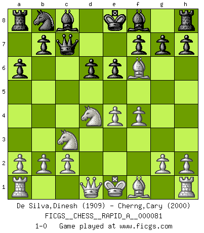 Last move : 1-0 2010 June 25 21:2:49 [Event "FICGS__CHESS__RAPID_A__000081"] [Site "FICGS"] [Date "2010.04.14"] [Round "1"] [White "De Silva,Dinesh"] [Black "Cherng,Cary"] [Result "1-0"] [WhiteElo "1909"] [BlackElo "2000"] 1.e4 c5 2.Nf3 d6 3.d4 cxd4 4.Nxd4 Nf6 5.Nc3 a6 6.Bg5 e6 7.f4 Qc7 8.Bxf6 1-0 This chess game has been lost on time (started : 2010.04.14 2:0:29) Sicilian : Najdorf, 7.f4 Player White won this chess game. Follow this game move after move (download)If Chess is a science, it's a most inexact one. If Chess is an art, it is too exacting to be seen as one. If Chess is a sport, it's too esoteric. If Chess is a game, it's too demanding to be just a game. If Chess is a mistress, she's a demanding one. If Chess is a passion, it's a rewarding one. If Chess is life, it's a sad one. (Unknown) Der Vorposten provoziert a) eine Basis für neue Angriffe und b) eine Schwächung der gegnerischen Widerstandskraft in der fraglichen Linie. (Aaron Nimzowitsch) El Ajedrez es como la guerra en un tablero. (Bobby Fischer) La vie et les Echecs sont tous les deux une lutte constante. (Lasker) I think your argument is specious - I think your tie is ugly. (Gregory House to Dr. Foreman, House M.D.)