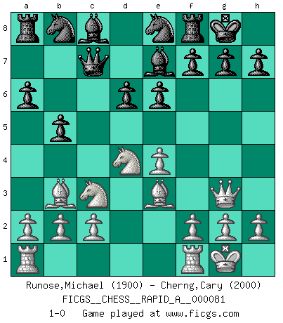 Last move : 1-0 2010 April 14 22:25:45 [Event "FICGS__CHESS__RAPID_A__000081"] [Site "FICGS"] [Date "2010.04.14"] [Round "1"] [White "Runose,Michael"] [Black "Cherng,Cary"] [Result "1-0"] [WhiteElo "1900"] [BlackElo "2000"] 1.e4 c5 2.Nf3 d6 3.d4 cxd4 4.Nxd4 Nf6 5.Nc3 a6 6.Bc4 e6 7.Bb3 b5 8.O-O Be7 9.Qf3 Qc7 10.Qg3 O-O 11.Bh6 Ne8 12.Be3 1-0 Sicilian : Najdorf, Lipnitzky attack Kingside Castling by player White (move 8) Kingside Castling by player Black (move 10) Player White won this chess game. Follow this game move after move (download)Nowadays, when you're not a grandmaster at 14, you can forget about it. (Anand Viswanathan) Nie in meinem Leben habe ich die französische Verteidigung gespielt, welche die Stumpfsinnigste von allen ist. (Wilhelm Steinitz) Me gusta decir que Bobby Fischer fue el mejor jugador que jamás haya existido. Pero lo que hizo de Fischer un genio, fue su habilidad de mezclar una frescura y pragmatismo Americano con ideas Rusas acerca de la estrategia. (Bruce Pandolfini) Les Echecs ont trois composantes : le temps, l'espace et le matériel en dernier. (Mikhail Tal) Convictions are more dangerous enemies of truth than lies. (Friedrich Nietzsche)