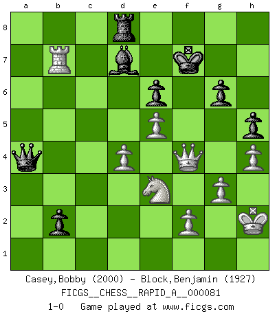 Last move : 1-0 2010 July 1 13:16:35 [Event "FICGS__CHESS__RAPID_A__000081"] [Site "FICGS"] [Date "2010.04.14"] [Round "1"] [White "Casey,Bobby"] [Black "Block,Benjamin"] [Result "1-0"] [WhiteElo "2000"] [BlackElo "1927"] 1.e4 c5 2.c3 Nf6 3.e5 Nd5 4.Nf3 e6 5.Bc4 d6 6.d4 Nc6 7.O-O cxd4 8.cxd4 Be7 9.Bd2 Nb6 10.Bb3 O-O 11.Qe2 Bd7 12.Na3 d5 13.Nc2 Rc8 14.Ne3 Na8 15.Rfc1 h5 16.Qd3 Nb6 17.g3 a5 18.Ng2 Nc4 19.Bxc4 dxc4 20.Rxc4 Qb6 21.Ne3 Qxb2 22.Rb1 Qxa2 23.Rxb7 Rfd8 24.h4 g6 25.Qe4 Bb4 26.Bxb4 axb4 27.Ng5 b3 28.Nxf7 Kxf7 29.Rxc6 Rxc6 30.Qxc6 b2 31.Qe4 Qa1+ 32.Kh2 Qa4 33.Qf4+ 1-0 Sicilian : Alapin's variation (2.c3) Kingside Castling by player White (move 7) Kingside Castling by player Black (move 10) Player White won this chess game. Follow this game move after move (download)Chess opens and enriches your mind. (Saudin Robovic) Alles was ich jemals tun will ist Schach spielen. (Robert James Fischer) El Ajedrez es un terrible juego. Si no controlas el centro, tu oponente tiene una posición mas holgada. Si tienes control del centro, ¡entonces realmente tu tienes algo de que preocuparte!. (Siegbert Tarrasch) L'ordinateur a tué l'originalité. Il n'y a plus guère d'aventures sur l'échiquier. (Jacob Murray) Perhaps chess is the wrong game for the times (The Chess Master and the Computer, by Garry Kasparov - 2010)