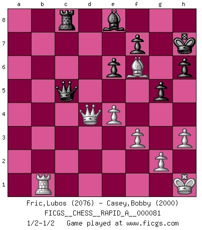 Last move : 1/2-1/2 2010 July 3 11:55:30 [Event "FICGS__CHESS__RAPID_A__000081"] [Site "FICGS"] [Date "2010.04.14"] [Round "1"] [White "Fric,Lubos"] [Black "Casey,Bobby"] [Result "1/2-1/2"] [WhiteElo "2076"] [BlackElo "2000"] 1.c4 e6 2.d4 Nf6 3.Nf3 d5 4.Bg5 Be7 5.Nc3 h6 6.Bh4 O-O 7.Rc1 b6 8.e3 Bb7 9.Be2 dxc4 10.O-O Nbd7 11.Bxc4 c5 12.Qe2 a6 13.a4 Nd5 14.Bg3 N7f6 15.Ne5 Bd6 16.Bd3 Nxc3 17.bxc3 Ne4 18.Bxe4 Bxe4 19.f3 Bb7 20.Rb1 Qc7 21.Rfd1 Rfc8 22.e4 Rab8 23.Kh1 Rd8 24.Bh4 g5 25.Bf2 Bxe5 26.dxe5 Rxd1+ 27.Qxd1 Rd8 28.Qb3 Bc6 29.h3 b5 30.axb5 axb5 31.c4 bxc4 32.Qxc4 Qxe5 33.Bxc5 Kh7 34.Ba3 Qa5 35.Be7 Rc8 36.Qd4 Be8 37.Bf6 Qc5 1/2-1/2 English Opening Kingside Castling by player Black (move 6) Kingside Castling by player White (move 10) This chess game ended in a draw. Follow this game move after move (download)We don't really know how the game was invented, though there are suspicions. As soon as we discover the culprits, we'll let you know. (Bruce Pandolfini) Die jungen Leute sollen verstehen, dass sie noch etwas von mir lernen können und müssen. (Viktor Kortschnoi) El jugador de combinación piensa hacia adelante; comienza de la posición dada y trabaja las movidas contundentes en su mente. (Emanuel Lasker) Même si l'adversaire joue le coup analysé précédemment, recommencez l'analyse en voyant la nouvelle position. Première règle de Blumenfeld Those parts of the system that you can hit with a hammer (not advised) are called hardware; those program instructions that you can only curse at are called software. (Anonymous)