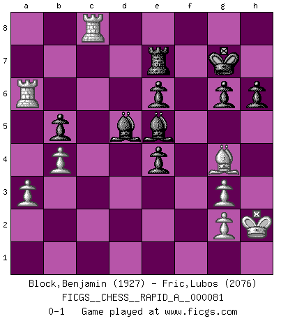 Last move : 0-1 2010 August 19 22:43:20 [Event "FICGS__CHESS__RAPID_A__000081"] [Site "FICGS"] [Date "2010.04.14"] [Round "1"] [White "Block,Benjamin"] [Black "Fric,Lubos"] [Result "0-1"] [WhiteElo "1927"] [BlackElo "2076"] 1.e4 e6 2.d4 d5 3.Nc3 Nf6 4.e5 Nfd7 5.f4 c5 6.Nf3 Nc6 7.Be3 a6 8.Qd2 Be7 9.Be2 O-O 10.O-O b5 11.a3 Qc7 12.dxc5 Nxc5 13.Qe1 Bb7 14.Rd1 Ne4 15.Nxe4 dxe4 16.Nd2 Rfd8 17.c3 Na5 18.b4 Qxc3 19.Bb6 Nb3 20.Nxb3 Qxb3 21.Bxd8 Bxd8 22.Kh1 h6 23.Rd6 Bd5 24.Qg3 Qxg3 25.hxg3 Bc7 26.Rd7 Bb6 27.Rc1 g6 28.Kh2 Kg7 29.Rd6 Bd4 30.Rc2 Ra7 31.Rc8 f6 32.Bg4 Re7 33.Rxa6 fxe5 34.fxe5 Bxe5 0-1 This chess game has been lost on time (started : 2010.04.14 2:0:29) French : Steinitz, Boleslavsky variation Kingside Castling by player Black (move 9) Kingside Castling by player White (move 10) Player Black won this chess game. Follow this game move after move (download)The laws of Chess do not permit a free choice: you have to move whether you like it or not. (Emanuel Lasker) Schach ist ein schwarz-weisser Dschungel. (Garry Kasparov) Del Ajedrez se ha dicho que la vida no es lo suficientemente larga para él, pero eso es culpa de la vida, no del Ajedrez. (William Ewart Napier) Ce n'est pas pour s'amuser qu'il joue aux échecs : il célèbre un culte. (Vladimir Nabokov) I believe in luck. How else can you explain the success of those you dislike ? (Jean Cocteau)