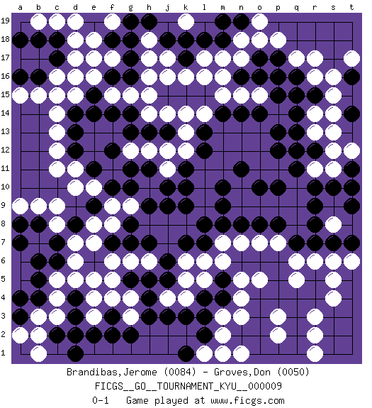 Last move : 0-1 2007 January 2 22:23:40 [Event "FICGS__GO__TOURNAMENT_KYU__000009"] [Site "FICGS"] [Date "2006.10.29"] [Round "1"] [Black "Brandibas,Jerome"] [White "Groves,Don"] [Result "0-1"] [Rating 1 "0084"] [Rating 2 "0050"] 1.d4 d17 2.q4 r16 3.q14 q12 4.q16 q17 5.p16 c15 6.d14 k16 7.p17 r17 8.r15 q9 9.p13 r13 10.q13 k4 11.k10 d10 12.q11 r11 13.p12 s12 14.r12 s15 15.q12 r14 16.q15 q6 17.r10 s11 18.r9 q10 19.r8 q8 20.q7 p7 21.r7 r6 22.s10 s6 23.s7 t6 24.t7 t12 25.t10 s8 26.t11 s13 27.p8 p9 28.o8 o9 29.p6 o7 30.n8 n9 31.n6 n7 32.m8 m7 33.r5 s4 34.m9 n10 35.n11 s9 36.m10 t8 37.t9 s8 38.o10 m6 39.p5 s5 40.r4 r3 41.q3 r2 42.q2 r1 43.q1 n5 44.o6 o5 45.o4 n4 46.o3 q5 47.p4 n3 48.n2 m2 49.o1 p2 50.o2 m1 51.l4 l5 52.l3 n1 53.m4 m3 54.k3 j4 55.l2 p3 56.p1 p3 57.t14 s14 58.m5 p2 59.j3 k6 60.h4 h6 61.j6 j7 62.j5 k5 63.h5 g6 64.k7 l6 65.l7 k8 66.l8 h8 67.j9 j8 68.g7 f6 69.g8 d6 70.h7 f4 71.h9 f13 72.e15 e16 73.f16 d15 74.e17 d16 75.f14 e13 76.e14 g15 77.g14 h14 78.g13 f17 79.g16 h16 80.g17 e18 81.f18 e17 82.g19 h18 83.g18 h17 84.f12 e12 85.g11 k13 86.e11 c12 87.d12 d11 88.d13 n17 89.n16 m16 90.j15 h15 91.o17 n15 92.o16 n18 93.h19 f15 94.j18 j17 95.k18 l17 96.l18 k19 97.m18 m17 98.n19 o19 99.m19 o18 100.l15 m15 101.d8 c3 102.d3 c4 103.c2 b2 104.d1 b1 105.f3 g3 106.h3 g4 107.g2 e3 108.f2 e4 109.e2 d5 110.d2 c8 111.b5 c5 112.c7 c9 113.b8 b9 114.a7 d7 115.b6 e8 116.b4 b3 117.c6 a9 118.a8 f9 119.f10 g9 120.g10 c13 121.j13 j14 122.e9 f8 123.k9 e10 124.f7 e7 125.l13 l14 126.m14 k14 127.n14 k12 128.l12 j12 129.h13 h12 130.k11 g12 131.h11 o15 132.o14 p18 133.g5 f5 134.a3 a2 135.a4 j11 136.j10 l1 137.k1 c14 138.e19 d19 139.k17 j16 140.c18 d18 141.k15 l16 142.t16 s16 143.p15 t17 144.c17 c19 145.b16 b15 146.a16 c16 147.b18 b19 148.a18 a15 149.p10 c11 150.e6 e5 151.pass f19 0-1 Here are the names of the openings (joseki) played in the four corners : Corner q16 : r16 q14 Komoku (Somok, Xiao~mu`) 3-4 Point. The komoku (3-4) point is the traditional corner enclosure move.. Corner q4 : q4 q9 Hoshi (Hwajeom, Seongjeom, Xingwei`) 4-4 Point. The star or hoshi (4-4) point, emphasizing influence at the potential expense of territory. Corner d4 : d4 j4 Hoshi (Hwajeom, Seongjeom, Xingwei`) 4-4 Point. The star or hoshi (4-4) point, emphasizing influence at the potential expense of territory. Player White won this Go (weiqi, baduk) game. Follow this game move after move (download)White is always trying to kill a bigger group than black is trying to save. (Anonymous) The beginning of wisdom is silence. The second step is listening. (Unknown)