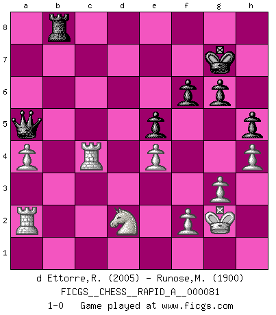 Last move : 1-0 2010 August 10 16:26:55 [Event "FICGS__CHESS__RAPID_A__000081"] [Site "FICGS"] [Date "2010.04.14"] [Round "1"] [White "d Ettorre,Rodolfo"] [Black "Runose,Michael"] [Result "1-0"] [WhiteElo "2005"] [BlackElo "1900"] 1.Nf3 Nf6 2.g3 g6 3.Bg2 Bg7 4.O-O O-O 5.d4 d5 6.c4 dxc4 7.Na3 Nc6 8.Nxc4 Bf5 9.b3 Qc8 10.Bb2 Rd8 11.Re1 Nb4 12.Nh4 Bh3 13.e4 Bxg2 14.Kxg2 c5 15.a3 Nc6 16.d5 e6 17.d6 b5 18.Ne5 Nxe5 19.Bxe5 Ne8 20.Bxg7 Rxd6 21.Qe2 Kxg7 22.Qxb5 Rb8 23.Qc4 Rdb6 24.Re3 Nd6 25.Qc2 c4 26.b4 e5 27.Nf3 f6 28.Rd1 Qc6 29.Nd2 a5 30.bxa5 Rb2 31.Qc3 Ra2 32.Ra1 Nb5 33.Rxa2 Nxc3 34.Rxc3 Qa8 35.Rxc4 Qxa5 36.h4 h5 37.a4 1-0 Reti : King's Indian attack Kingside Castling by player White (move 4) Kingside Castling by player Black (move 4) Player White won this chess game. Follow this game move after move (download)For me, Chess is life and every game is like a new life. Every Chess player gets to live many lives in one lifetime. (Eduard Gufeld) Wer mein Gambit spielt, muß bereit sein, alle Brücken hinter sich abzubrechen. Es verändert den ganzen Menschen. Es wirkt wie ein Zauberstab und fördert verkümmerte, gute Charakter- eigenschaften wieder zu Tage. (Emil Joseph Diemer) Realmente no sabemos como el juego fue inventado, aunque hay sospechas. Tan pronto como descubramos a los culpables, se los haremos saber. (Bruce Pandolfini) Aux échecs, les retours au sommet sont rares : les dommages psychologiques consécutifs à une défaite sont trop sévères. (Daily Telegraph) Memory is a way of holding onto the things you love, the things you are, the things you never want to lose. (from the television show: The Wonder Years)