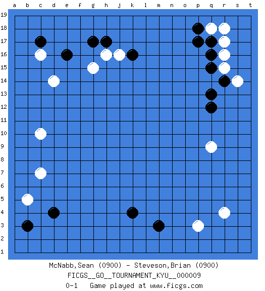 Last move : 0-1 2006 December 22 13:45:3 [Event "FICGS__GO__TOURNAMENT_KYU__000009"] [Site "FICGS"] [Date "2006.10.29"] [Round "1"] [Black "McNabb,Sean"] [White "Steveson,Brian"] [Result "0-1"] [Rating 1 "0900"] [Rating 2 "0900"] 1.q16 r4 2.d4 c16 3.e16 d14 4.c17 c10 5.k16 p3 6.k4 q9 7.q12 c7 8.m3 b5 9.b3 r17 10.q17 r16 11.q15 r15 12.r14 q18 13.p18 r18 14.p17 s14 15.q13 h16 16.g17 g15 17.h17 j16 0-1 This go game has been lost on time (started : 2006.10.29 8:26:48) Here are the names of the openings (joseki) played in the four corners : Corner d16 : c16 e16 Komoku (Somok, Xiao~mu`) 3-4 Point. The komoku (3-4) point is the traditional corner enclosure move.. Ikken Takagakari (Hankan Nop'dakeolch'im, Yi Gaogua`jiao~, 1-Space High Approach). The 5-4 approach move has become more popular in modern times, as modern Go emphasizes speed and influence. Corner d4 : d4 c7 Hoshi (Hwajeom, Seongjeom, Xingwei`) 4-4 Point. The star or hoshi (4-4) point, emphasizing influence at the potential expense of territory. Nikken Kakari (Dukan Keolch'im, E`r Gua`jiao~, 2-Space Low Approach). Black typically answers by 7-3 or 3-5 (which is not joseki). Player White won this Go (weiqi, baduk) game. Follow this game move after move (download)Proverbs do not apply to White. (Tero Sand) Plans are ideas that never come to fruition. (Daniel Parmet)