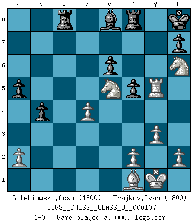 Last move : 1-0 2010 September 24 21:5:9 [Event "FICGS__CHESS__CLASS_B__000107"] [Site "FICGS"] [Date "2010.04.14"] [Round "1"] [White "Golebiowski,Adam"] [Black "Trajkov,Ivan"] [Result "1-0"] [WhiteElo "1800"] [BlackElo "1800"] 1.Nf3 c5 2.c4 e6 3.g3 Nf6 4.Bg2 d5 5.O-O Nc6 6.d4 dxc4 7.Qa4 Bd7 8.Qxc4 b5 9.Qd3 Rc8 10.dxc5 Bxc5 11.Nc3 Nb4 12.Qd1 Bc6 13.Qxd8+ Rxd8 14.Bg5 O-O 15.Rac1 Rc8 16.Bxf6 gxf6 17.Rfd1 Nd5 18.Ne4 Ne3 19.Nxf6+ Kg7 20.Nh5+ Kh6 21.Rd3 Nc4 22.Nf6 Nxb2 23.Rxc5 Nxd3 24.Ng4+ Kg7 25.Rg5+ Kh8 26.exd3 f5 27.Nfe5 Be8 28.Nh6 b4 29.d4 a5 30.Bf1 1-0 This chess game has been lost on time (started : 2010.04.14 13:7:35) Reti Opening Kingside Castling by player White (move 5) Kingside Castling by player Black (move 14) Player White won this chess game. Follow this game move after move (download)My style is somewhere between that of Tal and Petrosian. (Reshevsky) Es ist besser die Steine des Gegners zu opfern. (Savielly Grigorievitsch Tartakower) Las combinaciones han sido siempre el aspecto más intrigante del Ajedrez. Los Maestros las buscan, el público las aplauden, los críticos las alaban. La razón se debe a que las combinaciones hacen posible que el Ajedrez sea más que un ejercicio matemático con una carencia de vida. Ellas son la poesía del juego, son del Ajedrez lo que la melodía es de la música. Ellas representan el triunfo de la mente sobre la materia. (Reuben Fine) Fischer est le meilleur joueur du monde et Karpov n'est qu'un joueur de bistrot. (Garry Kasparov, agé de 16 ans) Real knowledge is to know the extent of one's ignorance. (Confucius)