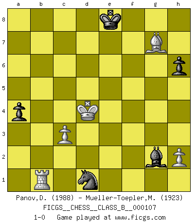 Last move : 1-0 2010 June 14 9:29:33 [Event "FICGS__CHESS__CLASS_B__000107"] [Site "FICGS"] [Date "2010.04.14"] [Round "1"] [White "Panov,Dmitriy"] [Black "Mueller-Toepler,Michael"] [Result "1-0"] [WhiteElo "1988"] [BlackElo "1923"] 1.e4 e5 2.Nf3 f5 3.Nxe5 Qf6 4.d4 d6 5.Nc4 fxe4 6.Nc3 Qg6 7.f3 exf3 8.Qxf3 Nf6 9.Ne3 Nc6 10.Bd3 Qf7 11.Ned5 Nxd4 12.Qe3+ Ne6 13.O-O Be7 14.Bc4 O-O 15.Nxc7 d5 16.N3xd5 Nxd5 17.Rxf7 Nxe3 18.Rxe7 Nxc4 19.Nxa8 Nd4 20.c3 Nc2 21.Rb1 Bf5 22.Nc7 Ne1 23.Ne6 Bxb1 24.Nxf8 Kxf8 25.Rxe1 Bxa2 26.Rd1 b6 27.Rd7 a5 28.Rc7 h6 29.Kf2 a4 30.Kf3 Na5 31.Ke4 Bf7 32.Bf4 Nc4 33.Kd4 b5 34.Rb7 Be8 35.Be5 Bc6 36.Bxg7+ Ke8 37.Rc7 Bxg2 38.Rc5 Nxb2 39.Rxb5 Nd1 40.Rb1 1-0 Latvian counter-gambit Kingside Castling by player White (move 13) Kingside Castling by player Black (move 14) 10 pieces endgame at move 39 : White KRBPP , Black KBNPP WHITE : King + 1 Rook 1 Bishop 2 Pawns BLACK : King + 1 Bishop 1 Knight 2 Pawns Player White won this chess game. Follow this game move after move (download)All Chess players should have a hobby. (Savielly Tartakower) Wenn sie aufgeben, dann danke ich Ihnen für das Spiel (Eventualzug beim Fernschach). (Anonymous) ¿Porque tengo que perder ante este idiota?. (Aron Nimzovich) La conception d'un plan est le processus par lequel un joueur exploite les avantages de sa position tout en s'efforçant d'en réduire au minimum les inconvénients. Afin de garantir le succès, un plan doit toujours se fonder sur un diagnostic objectif des particularités d'une position. La conception d'un plan est d'autant plus difficile que la position est équilibrée, et grandement facilitée lorsqu'il n'existe qu'un seul plan susceptible de répondre aux exigences de la position. (Harry Golombek) Establishing goals is all right if you don't let them deprive you of interesting detours. (Doug Larson)