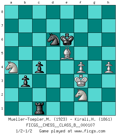 Last move : 1/2-1/2 2010 December 27 0:42:59 [Event "FICGS__CHESS__CLASS_B__000107"] [Site "FICGS"] [Date "2010.04.14"] [Round "1"] [White "Mueller-Toepler,Michael"] [Black "Kirali,Hasan"] [Result "1/2-1/2"] [WhiteElo "1923"] [BlackElo "1861"] 1.e4 b6 2.d4 Bb7 3.Bd3 e6 4.c4 f5 5.exf5 Bxg2 6.Qh5+ g6 7.fxg6 Bg7 8.gxh7 Kf8 9.Ne2 Nf6 10.Qh4 Bxh1 11.Bg5 Nc6 12.Nd2 Kf7 13.Ng3 d5 14.Nxh1 dxc4 15.Be4 Qd7 16.Ng3 Nxd4 17.Bxa8 Nc2+ 18.Kf1 Nxa1 19.Be4 Nxe4 20.Ngxe4 Qd5 21.Qh5+ Kf8 22.Qg6 Qd3+ 23.Kg1 Qd7 24.Ng3 Qf7 25.Qe4 Bxb2 26.Nxc4 Qxh7 27.Nxb2 Qxe4 28.Nxe4 Rh3 29.Nc4 Nc2 30.Kg2 Rd3 31.Bf4 Rd4 32.Ncd2 c5 33.Bb8 Nb4 34.Bxa7 Nd5 35.Bb8 Ra4 36.Be5 Kf7 37.Kf3 Kg6 38.Kg4 c4 39.f4 b5 40.Nc5 Rxa2 41.Nde4 b4 42.Nxe6 Ne3+ 43.Kf3 Nf5 44.Nf8+ Kf7 45.Nd7 Ra3+ 46.Kf2 Rd3 47.Ndc5 Rd1 48.h3 Rh1 49.Ke2 Rh2+ 50.Nf2 Rg2 51.Na6 b3 52.Nc5 Ke7 53.Na4 Ke6 54.Nb6 Nd6 55.Kf3 Rg1 56.h4 Rc1 57.Na4 1/2-1/2 Owen defense This chess game ended in a draw. Follow this game move after move (download)I like to say that Bobby Fischer was the greatest player ever. But what made Fischer a genius was his ability to blend an American freshness and pragmatism with Russian ideas about strategy. (Bruce Pandolfini) Kann Schach nicht schließlich das Nationalspiel der Deutschen werden? Und welche weiteren Ausblicke bieten sich dann dar! Welche Hebung des allgemeinen Kultur-Niveaus, ja der Moral, wenn das Schachbrett den Kartentisch verdrängen würde! Wahrlich, ein Ziel, des Schweißes der Edlen wert! (Siegbert Tarrasch) El Ajedrez era la lengua materna de Capablanca. (Reti) Il s'avisa de me proposer d'apprendre les échecs qu'il jouait un peu... me voilà forcené des échecs. J'achète un échiquier, je m'enferme dans ma chambre, j'y passe des jours et des nuits à vouloir apprendre par cur toutes les parties. (Jean-Jacques Rousseau, Confessions) May I never be complete. May I never be content. May I never be perfect. Deliver me, Tyler, from being perfect and complete. (Chuck Palahniuk, Fight Club)