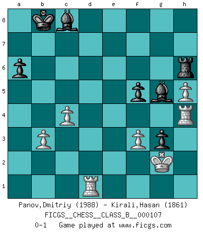 Last move : 0-1 2010 November 7 9:52:41 [Event "FICGS__CHESS__CLASS_B__000107"] [Site "FICGS"] [Date "2010.04.14"] [Round "1"] [White "Panov,Dmitriy"] [Black "Kirali,Hasan"] [Result "0-1"] [WhiteElo "1988"] [BlackElo "1861"] 1.e4 b6 2.d4 Bb7 3.Bd3 e6 4.Nf3 c5 5.O-O cxd4 6.Nxd4 Nc6 7.Nxc6 Bxc6 8.Nc3 Nf6 9.e5 Nd5 10.Nxd5 Bxd5 11.Qg4 h5 12.Qf4 Qc7 13.b3 Be7 14.Bb2 Bb7 15.Rad1 f5 16.Qe3 h4 17.h3 Rh6 18.Kh1 Rg6 19.f3 Rg3 20.Bb5 O-O-O 21.Bc3 g5 22.Be1 g4 23.Bxg3 hxg3 24.c4 gxh3 25.gxh3 a6 26.Ba4 Kb8 27.Qf4 Rg8 28.Kg2 Bg5 29.Qd4 b5 30.h4 Bh6 31.Qxd7 Qxe5 32.Qd6+ Qxd6 33.Rxd6 bxa4 34.Rxe6 Bf4 35.h5 Bc8 36.R6e1 Rd8 37.Rd1 Rh8 38.Rh1 axb3 39.axb3 Rh6 40.Rh4 Bg5 0-1 Owen defense Kingside Castling by player White (move 5) Queenside Castling by player Black (move 20) Player Black won this chess game. Follow this game move after move (download)A big shock; the best chess player in history has passed away. (Lajos Portisch, about Bobby Fischer's death) Ich moechte nie einem Club beitreten, der Leute wie mich als Mitglieder aufnimmt. (Woody Allen) La maestría del Ajedrez consiste esencialmente en analizar posiciónes de Ajedrez con precisión. (Mikhail Botvinnik) Karpov est une pièce de musée. (Garry Kasparov) Games, world of games... There's always an opponent, and there's always a victim. (Revolver, movie)