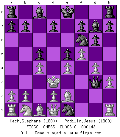 Last move : 0-1 2010 June 28 21:6:48 [Event "FICGS__CHESS__CLASS_C__000143"] [Site "FICGS"] [Date "2010.04.15"] [Round "1"] [White "Kech,Stephane"] [Black "Padilla,Jesus"] [Result "0-1"] [WhiteElo "1800"] [BlackElo "1800"] 1.e4 c5 2.c4 Nc6 3.g3 g6 4.f4 Bg7 5.g4 e5 6.f5 Qh4+ 7.Ke2 Nd4+ 8.Kd3 Nf6 9.h3 Qg3+ 10.Nf3 Nxf3 11.Be2 Ne1+ 0-1 Comment by player 1 : Stephane Kech : What can I do? Sicilian defense Player Black won this chess game. Follow this game move after move (download)Tactics flow from a superior position. (Bobby Fischer) Schach ist gnadenlos. Du mußt bereit sein zu töten. (Nigel Short) Cada Peón es una Reina en potencia. (James Mason) Même si l'adversaire joue le coup analysé précédemment, recommencez l'analyse en voyant la nouvelle position. Première règle de Blumenfeld A proverb is a short sentence based on long experience. (Miguel de Cervantes)