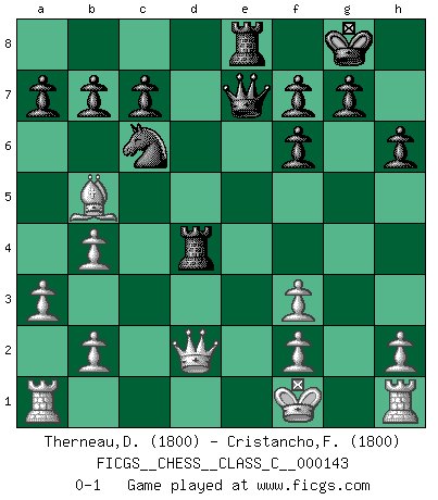 Last move : 0-1 2010 July 13 21:27:31 [Event "FICGS__CHESS__CLASS_C__000143"] [Site "FICGS"] [Date "2010.04.15"] [Round "1"] [White "Therneau,David"] [Black "Cristancho,Fernando"] [Result "0-1"] [WhiteElo "1800"] [BlackElo "1800"] 1.Nc3 d5 2.d4 Nf6 3.Bg5 h6 4.Bxf6 exf6 5.e4 dxe4 6.Nxe4 Bb4+ 7.c3 O-O 8.cxb4 Re8 9.Be2 Rxe4 10.Nf3 Qe7 11.Qd2 Nc6 12.a3 Bg4 13.Kf1 Re8 14.Bb5 Bxf3 15.gxf3 Rxd4 0-1 This chess game has been lost on time (started : 2010.04.15 17:57:48) Dunst (Sleipner, Heinrichsen) Opening Kingside Castling by player Black (move 7) Player Black won this chess game. Follow this game move after move (download)Robert Fischer is a law unto himself. (Larry Evans) Ein bischen Romantik kann weder im Schach noch in der Liebe schaden. Also versuche ich mich ab und zu daran zu erinnern. (Nigel Short) Los Peones son nacidos libres, y aún así, se encuentran encadenados por todos lados. (Rick Kennedy) Shah mat. Le roi est mort. Cri de fierté d'un joueur venant de terrasser son adversaire, courtoisement, sans effusion de sang. Nowadays, anyone who cannot speak English and is incapable of using the Internet is regarded as backward. (Al-Waleed bin Talal)