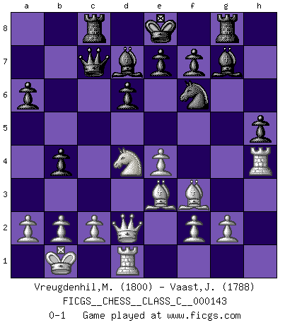 Last move : 0-1 2010 June 30 21:12:11 [Event "FICGS__CHESS__CLASS_C__000143"] [Site "FICGS"] [Date "2010.04.15"] [Round "1"] [White "Vreugdenhil,Maarten"] [Black "Vaast,Jean-Philippe"] [Result "0-1"] [WhiteElo "1800"] [BlackElo "1788"] 1.e4 c5 2.Nf3 d6 3.d4 cxd4 4.Nxd4 Nf6 5.Nc3 g6 6.Be2 Bg7 7.Be3 a6 8.h4 Nc6 9.h5 gxh5 10.Qd2 Bd7 11.O-O-O Rc8 12.Kb1 Qc7 13.Bxh5 b5 14.Nxc6 Bxc6 15.Bf3 Bd7 16.Ne2 b4 17.Rh4 Rg8 18.Nd4 h5 0-1 Sicilian : Dragon variation Queenside Castling by player White (move 11) Player Black won this chess game. Follow this game move after move (download)Excellence at Chess is one mark of a scheming mind. (Sir Arthur Conan Doyle) Das Schachspiel hat wie die Liebe, die Musik, die Fähigkeit, den Menschen glücklich zu machen. Ich habe ein leises Gefühl des Bedauerns für jeden, der das Schachspiel nicht kennt, so wie ich jeden bedaure, der die Liebe nicht kennt. (Siegbert Tarrasch) ¿Quién es tu oponente esta tarde? Esta tarde mi oponente son las piezas negras. (Akiba Rubinstein) J'apprécie les joueurs d'est-indienne, c'est grâce à eux que je nourris ma famille depuis tant d'années. (Petrosian) No enterprise is more likely to succeed than one concealed from the enemy until it is ripe for execution. (Niccolo Machiavelli)