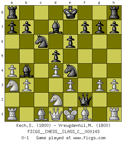 Last move : 0-1 2010 April 24 1:13:44 [Event "FICGS__CHESS__CLASS_C__000143"] [Site "FICGS"] [Date "2010.04.15"] [Round "1"] [White "Kech,Stephane"] [Black "Vreugdenhil,Maarten"] [Result "0-1"] [WhiteElo "1800"] [BlackElo "1800"] 1.d4 Nf6 2.Nf3 e6 3.h3 d5 4.b3 c5 5.c3 Nc6 6.e3 Ne4 7.a4 cxd4 8.cxd4 Bd7 9.Na3 Bb4+ 10.Nd2 Qf6 11.g3 Qxf2+ 0-1 Queen's pawn game Player Black won this chess game. Follow this game move after move (download)When you see a good move, look for a better one. (Emanuel Lasker) Der Freibauer hat für mich eine Seele, genau wie der Mensch, Wünsche, die unerkannt in ihm schlummern, und Befürchtungen, von deren Existenz er selbst kaum ahnt. (Aaron Nimzowitsch) No puedes jugar al Ajedrez si eres de corazón noble. (Proverbio Francés) Roi des jeux et jeu des rois, les échecs portent en eux un sentiment d'infini. Ils donnent à celui qui s'est efforcé d'en approfondir les arcanes l'impression de n'être pas à la mesure de l'homme; en fait, ils constituent un résumé de l'univers, un microcosme, et figurent cette grande échelle qui, dans les plans de la lumière descend jusqu'à la matière, qui des abîmes insondables remonte jusqu'en l'infini de Dieu. (Pyrame) I've never seen so many men wasted so badly. (Blondie in The Good, The Bad and The Ugly)
