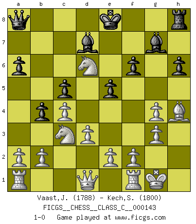 Last move : 1-0 2010 July 4 9:14:39 [Event "FICGS__CHESS__CLASS_C__000143"] [Site "FICGS"] [Date "2010.04.15"] [Round "1"] [White "Vaast,Jean-Philippe"] [Black "Kech,Stephane"] [Result "1-0"] [WhiteElo "1788"] [BlackElo "1800"] 1.c4 e5 2.g3 c5 3.Bg2 Nf6 4.Nc3 a6 5.d3 g5 6.Bxg5 Bg7 7.Nf3 h6 8.Bh4 d6 9.O-O Nc6 10.Nd2 b5 11.Bxc6+ Bd7 12.Bxa8 Qxa8 13.Nde4 Ng4 14.h3 f6 15.hxg4 b4 16.Nxd6+ 1-0 English Opening Kingside Castling by player White (move 9) Player White won this chess game. Follow this game move after move (download)You cannot play at Chess if you are kind-hearted. (French Proverb) Ein Springer auf f6 gegen die eigene Rochadestellung ist schlimmer als ein rostiger Nagel im Knie. (Efim Bogoljubov) El Ajedrez detiene a su maestro dentro de sus propios vínculos, encadenando la mente y el cerebro, por lo que la libertad interior del mas fuerte debe sufrir. (Albert Einstein) Il s'avisa de me proposer d'apprendre les échecs qu'il jouait un peu... me voilà forcené des échecs. J'achète un échiquier, je m'enferme dans ma chambre, j'y passe des jours et des nuits à vouloir apprendre par cur toutes les parties. (Jean-Jacques Rousseau, Confessions) The only difference between a tax man and a taxidermist is that the taxidermist leaves the skin. (Mark Twain)