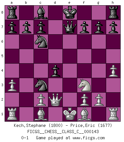 Last move : 0-1 2010 July 2 9:13:16 [Event "FICGS__CHESS__CLASS_C__000143"] [Site "FICGS"] [Date "2010.04.15"] [Round "1"] [White "Kech,Stephane"] [Black "Price,Eric"] [Result "0-1"] [WhiteElo "1800"] [BlackElo "1677"] 1.e4 e5 2.Nf3 Nc6 3.d3 Nf6 4.Nc3 Bb4 5.a3 Bxc3+ 6.bxc3 d5 7.exd5 Nxd5 8.d4 Nxc3 9.Qd2 exd4 10.h4 Qe7+ 0-1 King's pawn game Player Black won this chess game. Follow this game move after move (download)Chess, like any creative activity, can exist only through the combined efforts of those who have creative talent, and those who have the ability to organize their creative work. (Mikhail Botvinnik) Frage des Reporters: -Welche besonderen Umstände rechtfertigen das Anhalten der Uhren während einer Turnierpartie? Antwort: -Einen Fotographen zu strangulieren. (Siegbert Tarrasch) El Ajedrez es en su esencia, un juego. En su forma, un arte. Y en su ejecución, una ciencia. (Baron Tassilo) Karpov est une pièce de musée. (Garry Kasparov) The Movers & Shakers of this world are those who play chess in the mornings and go to the disco in the evenings. (Dinesh De Silva)