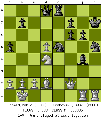 Last move : 1-0 2010 October 14 12:32:42 [Event "FICGS__CHESS__CLASS_M__000036"] [Site "FICGS"] [Date "2010.04.16"] [Round "1"] [White "Schmid,Pablo"] [Black "Krakovsky,Peter"] [Result "1-0"] [WhiteElo "2211"] [BlackElo "2200"] 1.e4 c5 2.Nc3 Nc6 3.Nf3 g6 4.d4 cxd4 5.Nxd4 Bg7 6.Be3 Nf6 7.Bc4 O-O 8.Bb3 d6 9.f3 Bd7 10.Qd2 Rc8 11.O-O-O Ne5 12.Kb1 Re8 13.h4 h5 14.g4 hxg4 15.h5 Nxh5 16.Bh6 Bf6 17.Nd5 a5 18.fxg4 Bxg4 19.Nxf6+ exf6 20.Rdg1 d5 21.Bxd5 Rc5 22.Qf2 Kh7 23.Bd2 Rxd5 24.exd5 1-0 Sicilian : Closed, 2...Nc6 Kingside Castling by player Black (move 7) Queenside Castling by player White (move 11) Player White won this chess game. Follow this game move after move (download)Discovered check is the dive bomber of the Chessboard. (Reuben Fine) Man kann eine Schachpartie nur gewinnen, wenn das Gleichgewicht gestört ist. In einer Stellung mit ungestörtem Gleichgewicht ist auch das größte Genie hilflos - in der Stellung steckt dann eben kein genialer Einfall. (Wilhelm Steinitz) Bendita sea la memoria de aquel que dio al mundo este juego inmortal. (A. G. Gardiner) Les Cavaliers se révèlent fort utiles dans les positions fermées. D'habitude, les Fous sont un peu plus forts que les Cavaliers dans les positions ouvertes. Qu'on le veuille ou non, il restera toujours des exceptions ! No, no, you're not thinking; you're just being logical. (Niels Bohr)