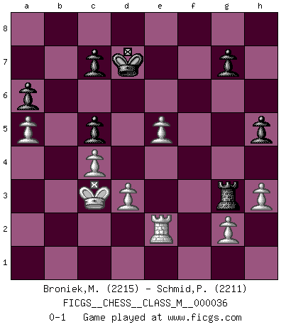 Last move : 0-1 2011 June 22 16:50:14 [Event "FICGS__CHESS__CLASS_M__000036"] [Site "FICGS"] [Date "2010.04.16"] [Round "1"] [White "Broniek,Mariusz Maciej"] [Black "Schmid,Pablo"] [Result "0-1"] [WhiteElo "2215"] [BlackElo "2211"] 1.e4 e5 2.Nf3 Nc6 3.Bb5 f5 4.Bxc6 dxc6 5.Nc3 Nf6 6.Qe2 fxe4 7.Nxe4 Bg4 8.h3 Bxf3 9.Qxf3 Nxe4 10.Qxe4 Qd5 11.d3 Bc5 12.Ke2 O-O-O 13.Re1 Bb6 14.f3 Qc5 15.Kd2 Rd5 16.b4 Qe7 17.Re2 Rhd8 18.Bb2 Qg5+ 19.Ke1 Qg3+ 20.Kd1 Bf2 21.Qg4+ Kb8 22.Qxg3 Bxg3 23.Re4 h5 24.a4 R8d6 25.Ke2 b6 26.Rd1 Rg6 27.Kf1 Rg5 28.Bc1 Rg6 29.Be3 Kb7 30.c4 R5d6 31.Bf2 Bxf2 32.Kxf2 Rge6 33.Ke3 Rd7 34.a5 Rd8 35.Ra1 a6 36.Re1 Rde8 37.Kd2 c5 38.bxc5 bxc5 39.f4 Rg6 40.R1e2 Kc6 41.Kc3 Rg3 42.Rxe5 Rxe5 43.fxe5 Kd7 0-1 Ruy Lopez : Schliemann defense Queenside Castling by player Black (move 12) Player Black won this chess game. Follow this game move after move (download)Chess opens and enriches your mind. (Saudin Robovic) Über Frauen: Chess is better. (Robert James Fischer) Bobby Fischer es el mas grande genio de Ajedrez de todos los tiempos. (Alexander Kotov) Psychologiquement, tu dois avoir confiance en toi même, mais cette confiance doit être basée sur des faits. (Robert Fischer) First of all, we have to go back to the classical time control. (Anatoly Karpov)
