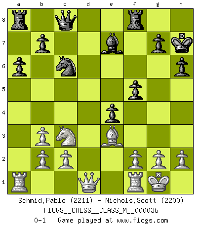 Last move : 0-1 2010 July 10 9:20:28 [Event "FICGS__CHESS__CLASS_M__000036"] [Site "FICGS"] [Date "2010.04.16"] [Round "1"] [White "Schmid,Pablo"] [Black "Nichols,Scott"] [Result "0-1"] [WhiteElo "2211"] [BlackElo "2200"] 1.e4 c5 2.Nc3 Nc6 3.Nf3 d6 4.d4 cxd4 5.Nxd4 Nf6 6.Bc4 e5 7.Nf3 Be7 8.O-O O-O 9.Bb3 h6 10.Qd3 Be6 11.Be3 a6 12.Nh4 Bxb3 13.axb3 Nxe4 14.Nxe4 Bxh4 15.Qxd6 Qc8 16.Qd1 Be7 17.Qf3 f5 18.Nc3 e4 19.Qd1 Kh7 0-1 This chess game has been lost on time (started : 2010.04.16 0:22:52) Sicilian : Closed, 2...Nc6 Kingside Castling by player White (move 8) Kingside Castling by player Black (move 8) Player Black won this chess game. Follow this game move after move (download)The older I grow, the more I value pawns. (Paul Keres) Ich spiele 70 Eröffnungssysteme. (Viktor Kortschnoi) El Ajedrez, como la música, como el amor, tiene el poder de hacer feliz a la gente. (Siegbert Tarrasch) Botvinnik disait en comparant les échecs à la musique: Il existe une science dont le but est l'étude de l'acoustique et des sons. Mais il y a aussi un art qui se sert de l'océan des sons : c'est la musique. De toute évidence, il en est de même pour la pensée. La logique est l'étude des lois de la réflexion et les échecs reflètent, en tant qu'art, le côté logique de la réflexion, sous la forme d'images artistiques... Extrait de Fischer - Spassky, Reykjavik 1972 par Alexander & F. Wyndham (Ed. Solar), p 37. Programmer - an organism that turns coffee into software. (Anonymous)