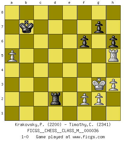 Last move : 1-0 2010 December 30 10:57:32 [Event "FICGS__CHESS__CLASS_M__000036"] [Site "FICGS"] [Date "2010.04.16"] [Round "1"] [White "Krakovsky,Peter"] [Black "Timothy,Chan Wei Xuan"] [Result "1-0"] [WhiteElo "2200"] [BlackElo "2341"] 1.e4 e5 2.Nf3 Nc6 3.Bb5 a6 4.Ba4 Nf6 5.O-O Be7 6.Re1 b5 7.Bb3 d6 8.c3 O-O 9.h3 Na5 10.Bc2 d5 11.exd5 e4 12.Bxe4 Nxe4 13.Rxe4 Bb7 14.d4 Re8 15.Bf4 Bxd5 16.Re1 Bd6 17.Bxd6 cxd6 18.Nbd2 Nc4 19.Qc2 Nxd2 20.Rxe8+ Qxe8 21.Nxd2 Qe2 22.b3 Re8 23.Rc1 Be4 24.Nxe4 Rxe4 25.a4 bxa4 26.bxa4 Qxc2 27.Rxc2 Re1+ 28.Kh2 Kf8 29.c4 Ke7 30.c5 Rd1 31.Re2+ Kd7 32.cxd6 Kxd6 33.Re5 Rxd4 34.Ra5 Kc6 35.Rxa6+ Kb7 36.Ra5 Rd2 37.Kg3 f6 38.Rh5 h6 39.a5 1-0 This chess game has been lost on time (started : 2010.04.16 0:22:52) Ruy Lopez : Closed Kingside Castling by player White (move 5) Kingside Castling by player Black (move 8) Player White won this chess game. Follow this game move after move (download)Pawn endings are to Chess what putting is to golf. (Cecil Purdy) Der Verteidiger gebe der Gewalt nach, aber nur der Gewalt. Er schaffe sich nicht freiwillig, etwa aus Blindheit oder aus Schrecken, irgendwelche Schwächen. Er lasse sich nicht bluffen. (Emanuel Lasker) Fischer era un maestro de claridad y un Rey del posicionamiento astuto. Sus oponentes podían ver hacia donde se dirigía pero eran impotentes para detenerlo. (Bruce Pandolfini) C'est une question de caractère, Beaucoup de gens perdent leur motivation très vite. D'autres, ils sont rares, peuvent la conserver très longtemps. J'aime les échecs, encore aujourd'hui je suis heureux d'analyser des parties. J'aime toujours gagner, je déteste encore perdre. Bien jouer est important pour mon intégrité intellectuelle et morale. Et puis les échecs vivent en ce moment une période historique grâce à Internet. Ils se développent dans les systèmes éducatifs à travers le monde. Ils sortent de leur ghetto, et c'est mon rôle de mener à bien cette révolution. (Gary Kasparov) There's no money in correspondence chess. (John Knudsen)