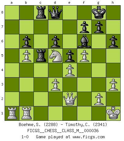Last move : 1-0 2011 February 4 9:57:37 [Event "FICGS__CHESS__CLASS_M__000036"] [Site "FICGS"] [Date "2010.04.16"] [Round "1"] [White "Boehme,Sebastian"] [Black "Timothy,Chan Wei Xuan"] [Result "1-0"] [WhiteElo "2288"] [BlackElo "2341"] 1.e4 c5 2.Nf3 Nc6 3.d4 cxd4 4.Nxd4 Qb6 5.Nb3 Nf6 6.Nc3 e6 7.Bd3 a6 8.O-O d6 9.Be3 Qc7 10.f4 Be7 11.a4 b6 12.Qf3 O-O 13.Qg3 Bb7 14.f5 Ne5 15.Nd4 Nxd3 16.cxd3 e5 17.Nc2 Rfc8 18.Bh6 Bf8 19.Ne3 Qd8 20.Bg5 Be7 21.Bxf6 Bxf6 22.Ncd5 Bxd5 23.Nxd5 Rc2 24.b4 Rac8 25.Kh1 h6 26.Qe3 R2c6 27.h3 Kf8 28.b5 axb5 29.axb5 Rc5 30.Rfb1 Kg8 31.Qe2 1-0 This chess game has been lost on time (started : 2010.04.16 0:22:52) Sicilian defense Kingside Castling by player White (move 8) Kingside Castling by player Black (move 12) Player White won this chess game. Follow this game move after move (download)There are two classes of men; those who are content to yield to circumstances and who play whist; those who aim to control circumstances, and who play Chess. (Mortimer Collins) Man gibt nur Pakete auf. (Paul Keres) Una buena ofensiva y una buena defensa, comienzan ambas con un buen desarrollo. (Bruce A. Moon) Le génie consiste à savoir transgresser les règles au moment opportun. (Teichmann) The arrogant army will lose certainly the battle. (Chinese proverb)