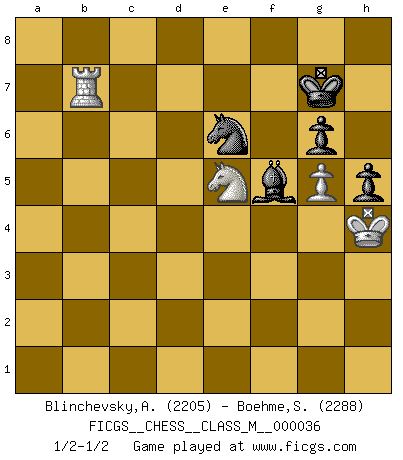 Last move : 1/2-1/2 2011 October 10 17:20:24 [Event "FICGS__CHESS__CLASS_M__000036"] [Site "FICGS"] [Date "2010.04.16"] [Round "1"] [White "Blinchevsky,Alexander"] [Black "Boehme,Sebastian"] [Result "1/2-1/2"] [WhiteElo "2205"] [BlackElo "2288"] 1.d4 d5 2.c4 e6 3.Nc3 Nf6 4.Nf3 c6 5.e3 Nbd7 6.Qc2 Bd6 7.Be2 O-O 8.b3 b6 9.Bb2 Bb7 10.O-O Qe7 11.Rfe1 Rac8 12.e4 Nxe4 13.Nxe4 dxe4 14.Qxe4 g6 15.a3 Rfd8 16.h3 a5 17.Qe3 Qf6 18.Ne5 Qe7 19.Ng4 h5 20.Nh6+ Kh7 21.g4 Qf6 22.g5 Qf4 23.Qxf4 Bxf4 24.Bf1 Rf8 25.h4 Rce8 26.Bg2 f6 27.Bc1 fxg5 28.hxg5 Bxc1 29.Raxc1 Rf4 30.b4 axb4 31.axb4 Rxd4 32.Rcd1 Rxd1 33.Rxd1 Re7 34.f4 Nf8 35.Rd8 Kg7 36.Rb8 Ba6 37.b5 cxb5 38.Rxb6 Bc8 39.cxb5 e5 40.Rc6 Bd7 41.Rc1 Re6 42.Bh3 Bxb5 43.Rc7+ Kh8 44.Bxe6 Nxe6 45.Nf7+ Kg8 46.Rb7 Bc6 47.Nh6+ Kh8 48.Rb6 Bd5 49.Nf7+ Kh7 50.Nxe5 Nxf4 51.Rd6 Be4 52.Kh2 Bf5 53.Kg3 Ne2+ 54.Kh4 Kg7 55.Rf6 Nd4 56.Rf7+ Kg8 57.Rb7 Kf8 58.Rb6 Kg7 59.Rb4 Ne6 60.Rb7+ 1/2-1/2 QGD Semi-Slav : Stoltz variation Kingside Castling by player Black (move 7) Kingside Castling by player White (move 10) 10 pieces endgame at move 50 : White KRNPP , Black KBNPP WHITE : King + 1 Rook 1 Knight 2 Pawns BLACK : King + 1 Bishop 1 Knight 2 Pawns 9 pieces endgame at move 50 : White KRNP , Black KBNPP WHITE : King + 1 Rook 1 Knight 1 Pawn BLACK : King + 1 Bishop 1 Knight 2 Pawns This chess game ended in a draw. Follow this game move after move (download)The boy (then a 12 year old boy named Anatoly Karpov) doesn't have a clue about Chess, and there's no future at all for him in this profession. (Mikhail Botvinnik) Das Schachspiel hat wie die Liebe, die Musik, die Fähigkeit, den Menschen glücklich zu machen. Ich habe ein leises Gefühl des Bedauerns für jeden, der das Schachspiel nicht kennt, so wie ich jeden bedaure, der die Liebe nicht kennt. (Siegbert Tarrasch) El Ajedrez es un regaderazo frío para la mente. (Sir John Simon) Même un GMI sait rarement calculer sur plus de cinq coups une attaque à sacrifices. (Rudolf Spielmann) The worth of a book is to be measured by what you can carry away from it. (James Bryce)