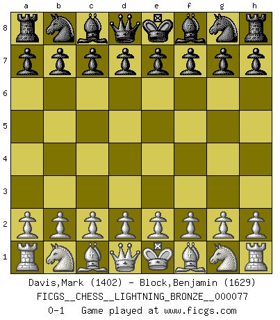 Last move : 0-1 2010 April 16 21:1:34 [Event "FICGS__CHESS__LIGHTNING_BRONZE__000077"] [Site "FICGS"] [Date "2010.04.16"] [Round "1"] [White "Davis,Mark"] [Black "Block,Benjamin"] [Result "0-1"] [WhiteElo "1402"] [BlackElo "1629"] 0-1 This chess game has been lost on time (started : 2010.04.16 17:55:9) Player Black won this chess game. Follow this game move after move (download)Chess is so inspiring that I do not believe a good player is capable of having an evil thought during the game. (Wilhelm Steinitz) Die größte Kunst beim Schach besteht darin dem Gegner nicht zu zeigen was er tun kann. (Garry Kasparov) Las piezas de Ajedrez son los bloques del alfabeto que moldean los pensamientos; y esos pensamientos, aunque hagan un diseño visual en el tablero, expresan abstractamente su belleza como un poema. (Marcel Duchamp) Botvinnik disait en comparant les échecs à la musique: Il existe une science dont le but est l'étude de l'acoustique et des sons. Mais il y a aussi un art qui se sert de l'océan des sons : c'est la musique. De toute évidence, il en est de même pour la pensée. La logique est l'étude des lois de la réflexion et les échecs reflètent, en tant qu'art, le côté logique de la réflexion, sous la forme d'images artistiques... Extrait de Fischer - Spassky, Reykjavik 1972 par Alexander & F. Wyndham (Ed. Solar), p 37. However beautiful the strategy, you should occasionally look at the results. (Winston Churchill)