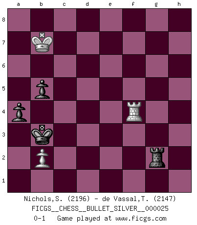 Last move : 0-1 2010 April 17 0:46:39 [Event "FICGS__CHESS__BULLET_SILVER__000025"] [Site "FICGS"] [Date "2010.04.16"] [Round "1"] [White "Nichols,Scott"] [Black "de Vassal,Thibault"] [Result "0-1"] [WhiteElo "2196"] [BlackElo "2147"] 1.e4 e6 2.d4 d5 3.Nd2 c5 4.Ngf3 Nf6 5.exd5 exd5 6.Be2 Nc6 7.O-O Be7 8.dxc5 Bxc5 9.Nb3 Bb6 10.Bg5 O-O 11.c3 Re8 12.Bh4 h6 13.Re1 g5 14.Bg3 Ne4 15.Nfd4 Nxg3 16.hxg3 a5 17.a4 Qd6 18.Qd2 Bd7 19.Bb5 Rad8 20.Rad1 Nxd4 21.Rxe8+ Rxe8 22.Nxd4 Bxb5 23.axb5 Re4 24.f3 Re5 25.Qd3 h5 26.Kf1 g4 27.Qd2 gxf3 28.gxf3 Qd7 29.Kg2 Qe8 30.Kh3 Bxd4 31.Qxd4 Qe6+ 32.g4 hxg4+ 33.Qxg4+ Kf8 34.Qxe6 fxe6 35.Rd2 Ke7 36.Kg4 Kd6 37.c4 Re3 38.b6 Rb3 39.cxd5 e5 40.Rh2 Kxd5 41.Re2 Kd6 42.Rd2+ Kc6 43.Rh2 Kxb6 44.Re2 Ka6 45.Kf5 Rxf3+ 46.Kxe5 a4 47.Rh2 b5 48.Ke4 Rb3 49.Ke5 Ka5 50.Kd5 Rg3 51.Kc6 Rg5 52.Rf2 Kb4 53.Rf3 Rg6+ 54.Kb7 Rg2 55.Rf4+ Kb3 0-1 French : Tarrasch, Open variation Kingside Castling by player White (move 7) Kingside Castling by player Black (move 10) 10 pieces endgame at move 40 : White KRPPP , Black KRPPP WHITE : King + 1 Rook 3 Pawns BLACK : King + 1 Rook 3 Pawns 9 pieces endgame at move 43 : White KRPP , Black KRPPP WHITE : King + 1 Rook 2 Pawns BLACK : King + 1 Rook 3 Pawns 8 pieces endgame at move 45 : White KRP , Black KRPPP WHITE : King + 1 Rook 1 Pawn BLACK : King + 1 Rook 3 Pawns 7 pieces endgame at move 46 : White KRP , Black KRPP WHITE : King + 1 Rook 1 Pawn BLACK : King + 1 Rook 2 Pawns Player Black won this chess game. Follow this game move after move (download)The hallmark of the artist is simplicity. (Larry Evans) Kostenjuk hat keinen Sexappeal. (Loek van Wely) Fischer era un maestro de claridad y un Rey del posicionamiento astuto. Sus oponentes podían ver hacia donde se dirigía pero eran impotentes para detenerlo. (Bruce Pandolfini) On croit qu'il y a plus de mauvais joueurs que de bons joueurs, c'est faux : Il y a autant de joueurs qui gagnent que de joueurs qui perdent. (Philippe Geluck) Opportunities multiply as they are seized. (Sun Tzu)
