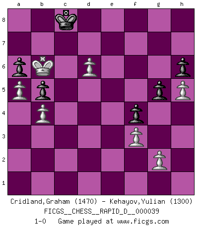 Last move : 1-0 2010 June 2 21:43:46 [Event "FICGS__CHESS__RAPID_D__000039"] [Site "FICGS"] [Date "2010.04.17"] [Round "1"] [White "Cridland,Graham"] [Black "Kehayov,Yulian"] [Result "1-0"] [WhiteElo "1470"] [BlackElo "1300"] 1.e4 e5 2.Nf3 d5 3.Nxe5 Bd6 4.d4 dxe4 5.Nc3 Bxe5 6.dxe5 Qxd1+ 7.Kxd1 Nc6 8.Nxe4 Nxe5 9.Bf4 Bf5 10.Bxe5 f6 11.Bxc7 Bxe4 12.Bd3 Bxd3 13.cxd3 Ne7 14.Re1 Rf8 15.Kd2 Rf7 16.Re2 Rc8 17.Bd6 Rd8 18.Ba3 Rd7 19.Rae1 Kd8 20.Bxe7+ Rfxe7 21.Rxe7 Rxe7 22.Rxe7 Kxe7 23.Kc3 Kd6 24.Kd4 Kc6 25.Kc4 a6 26.d4 b6 27.d5+ Kd6 28.Kd4 Kd7 29.b4 Kd6 30.a4 g6 31.a5 b5 32.h3 h6 33.h4 g5 34.h5 f5 35.f3 f4 36.Ke4 Kd7 37.Ke5 Ke7 38.d6+ Kd7 39.Kd5 Kd8 40.Kc6 Kc8 41.Kb6 1-0 QP counter-gambit (elephant gambit) Player White won this chess game. Follow this game move after move (download)The stomach is an essential part of the Chess master. (Bent Larsen) Drei Punkte vor allen anderen ist wie einer, der im weißen Anzug posiert, während der Rest in Müllsäcke gekleidet dasteht. (Viktor Kortschnoi) En un gambito tu regalas un Peón por el bién de tomar un juego perdido. (Samuel Standige Boden) Le plus grand jeu de l'esprit jamais inventé, plus vous l'apprenez, plus vous y prenez du plaisir. (Garry Kasparov) Games, world of games... There's always an opponent, and there's always a victim. (Revolver, movie)