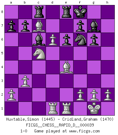 Last move : 1-0 2010 July 1 0:54:55 [Event "FICGS__CHESS__RAPID_D__000039"] [Site "FICGS"] [Date "2010.04.17"] [Round "1"] [White "Huxtable,Simon"] [Black "Cridland,Graham"] [Result "1-0"] [WhiteElo "1445"] [BlackElo "1470"] 1.d4 d5 2.c4 dxc4 3.Nc3 Nf6 4.e4 c5 5.d5 Qa5 6.Bxc4 Nxe4 7.Qa4+ Qxa4 8.Nxa4 Bd7 9.Nc3 Nd6 10.Bd3 g6 11.Nf3 Bg7 12.Bf4 O-O 13.O-O Bg4 14.Ne5 Bc8 15.Rfe1 Re8 16.Rad1 Nd7 17.Nxg6 hxg6 18.Bxd6 Kf8 19.Bc7 Nf6 20.d6 e6 21.b3 Bd7 22.Ne4 Rac8 23.Nxc5 Bc6 24.Be4 1-0 Queen's gambit accepted Kingside Castling by player Black (move 12) Kingside Castling by player White (move 13) Player White won this chess game. Follow this game move after move (download)The enormous mental resilience, without which no Chess player can exist, was so much taken up by Chess that he could never free his mind of this game. (Albert Einstein) Ein Gewinn durch eine ungenaue Kombination, sei sie auch noch so vorzeigbar, erfüllt mich mit Schaudern. (Wilhelm Steinitz) Evita las multitudes. Haz independientemente tu propio razonamiento. Trata de ser el jugador de Ajedrez, no la pieza de Ajedrez. (Ralph Charell) Votre seul travail dans les ouvertures est d'obtenir un milieu de partie jouable. (Lajos Portish) All maxims have their antagonist maxims; proverbs should be sold in pairs, a single one being but a half truth. (William Mathews)