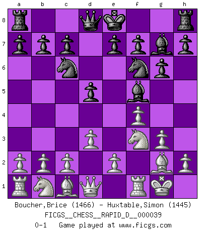 Last move : 0-1 2010 July 8 9:18:56 [Event "FICGS__CHESS__RAPID_D__000039"] [Site "FICGS"] [Date "2010.04.17"] [Round "1"] [White "Boucher,Brice"] [Black "Huxtable,Simon"] [Result "0-1"] [WhiteElo "1466"] [BlackElo "1445"] 1.f4 d5 2.Nf3 g6 3.g3 Bf5 4.d3 Nf6 5.Bg2 Bg7 6.O-O Nc6 0-1 This chess game has been lost on time (started : 2010.04.17 3:12:3) Bird's Opening Kingside Castling by player White (move 6) Player Black won this chess game. Follow this game move after move (download)In blitz, the Knight is stronger than the Bishop. (Vlastimil Hort) Wer sich die Fähigkeit anerziehen will im Schach selbstständig zu denken, der muß alles meiden, was leblos ist: ausgeklügelte Theorien, die sich auf sehr wenige Beispiele und eine Menge Hirngespinste stützen. (Emanuel Lasker) No existe un remordimiento como el remordimiento del Ajedrez. (H. G. Wells) Des idées, des idées, j'en ai cent, j'en ai mille. Des bonnes, des mauvaises, applicables, irréalisables... Il suffit de faire le tri ! (Roos) All war is based on deception. (Sun Tzu)