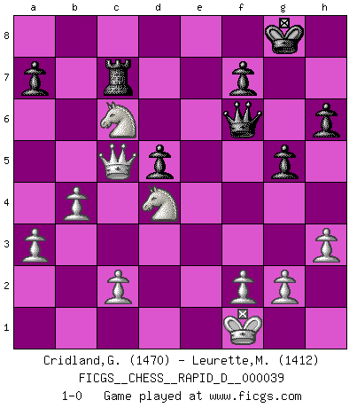 Last move : 1-0 2010 May 23 23:8:2 [Event "FICGS__CHESS__RAPID_D__000039"] [Site "FICGS"] [Date "2010.04.17"] [Round "1"] [White "Cridland,Graham"] [Black "Leurette,Marc-Antoine"] [Result "1-0"] [WhiteElo "1470"] [BlackElo "1412"] 1.e4 e5 2.Nf3 Nc6 3.Bb5 Nf6 4.O-O Nxe4 5.d4 Nd6 6.Bxc6 bxc6 7.dxe5 Ba6 8.exd6 Bxf1 9.dxc7 Qxc7 10.Qxf1 Be7 11.Nc3 O-O 12.Ne4 d5 13.Neg5 h6 14.Nh3 Bf6 15.Rb1 Qa5 16.a3 Qa4 17.b3 Qg4 18.Nf4 Rfe8 19.h3 Qf5 20.Qd1 Rad8 21.Nd3 Bc3 22.Bd2 Bxd2 23.Qxd2 Rd6 24.b4 Rg6 25.Kf1 Rf6 26.Re1 Rfe6 27.Rxe6 Qxe6 28.Nc5 Qf6 29.Nd4 Kh7 30.Qd3+ Kg8 31.Ncb3 g6 32.Qc3 Rc8 33.Qc5 Rc7 34.Na5 g5 35.Naxc6 1-0 Ruy Lopez : Berlin defense, Open variation Kingside Castling by player White (move 4) Kingside Castling by player Black (move 11) Player White won this chess game. Follow this game move after move (download)Chess, like any creative activity, can exist only through the combined efforts of those who have creative talent, and those who have the ability to organize their creative work. (Mikhail Botvinnik) Kein Schachspieler kann gut schlafen. (H. G. Wells) En la vida, como en el Ajedrez, los Peones propios obstruyen nuestro camino. La gran fortuna de un hombre, su comodidad, placer, hijos, libros, que deberían ayudarle a ganar, con mucha frecuencia lo ponen en Jaque Mate. (Charles Buxton) Les échecs, c'est la lutte contre l'erreur. (Johannes Zukertort) Chess is everything: art, science and sport. (Anatoly Karpov)