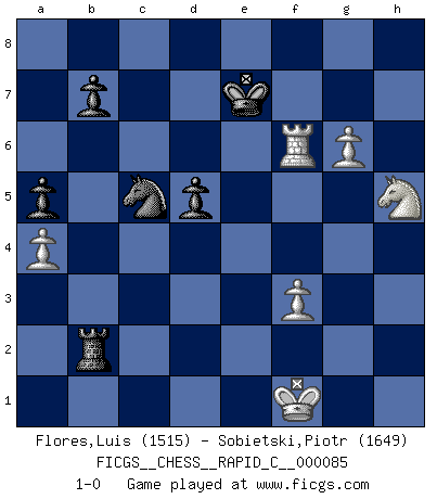 Last move : 1-0 2010 August 4 13:47:48 [Event "FICGS__CHESS__RAPID_C__000085"] [Site "FICGS"] [Date "2010.04.17"] [Round "1"] [White "Flores,Luis"] [Black "Sobietski,Piotr"] [Result "1-0"] [WhiteElo "1515"] [BlackElo "1649"] 1.e4 d5 2.exd5 Nf6 3.Nc3 Nxd5 4.Bc4 Nb6 5.Bb3 Nc6 6.Nf3 Bf5 7.O-O e6 8.d3 Be7 9.Bf4 O-O 10.h3 h6 11.Qe2 a5 12.Nb5 Rc8 13.a4 Bd6 14.Bxd6 cxd6 15.c3 Re8 16.Rfe1 e5 17.Qe3 Ne7 18.Nh4 Ned5 19.Qf3 Be6 20.Nf5 Bxf5 21.Qxf5 Nf6 22.Rad1 Re7 23.Re2 Qd7 24.Qxd7 Rxd7 25.f3 Re8 26.g3 Kf8 27.Kg2 g6 28.h4 Nbd5 29.Bxd5 Nxd5 30.d4 f6 31.Kf2 Red8 32.h5 gxh5 33.Rh1 Kg7 34.Rxh5 Kg6 35.Rh4 h5 36.Re1 Kg5 37.Reh1 Rh8 38.c4 Nb4 39.Ke3 d5 40.c5 exd4+ 41.Nxd4 Re7+ 42.Kd2 f5 43.Ne2 Rc7 44.Nf4 Kf6 45.Rc1 Rhc8 46.Nxh5+ Kf7 47.Rf4 Rxc5 48.Rxf5+ Ke6 49.Rxc5 Rxc5 50.g4 Rc2+ 51.Ke3 Rxb2 52.Rf6+ Ke7 53.g5 Rb3+ 54.Kf2 Nd3+ 55.Ke2 Nc5 56.g6 Rb2+ 57.Kf1 1-0 Scandinavian defense Kingside Castling by player White (move 7) Kingside Castling by player Black (move 9) Player White won this chess game. Follow this game move after move (download)For me, Chess is life and every game is like a new life. Every Chess player gets to live many lives in one lifetime. (Eduard Gufeld) Ich verstehe Aljechins Kombinationen ganz gut; aber woher er diese Angriffschancen bekommt und wie er die Eröffnung behandelt das ist für mich ein Buch mit sieben Siegeln. (Rudolf Spielmann) Evita las multitudes. Haz independientemente tu propio razonamiento. Trata de ser el jugador de Ajedrez, no la pieza de Ajedrez. (Ralph Charell) Le plus grand jeu de l'esprit jamais inventé, plus vous l'apprenez, plus vous y prenez du plaisir. (Garry Kasparov) The smarter you play, the luckier you'll be. (Mark Pilarski)
