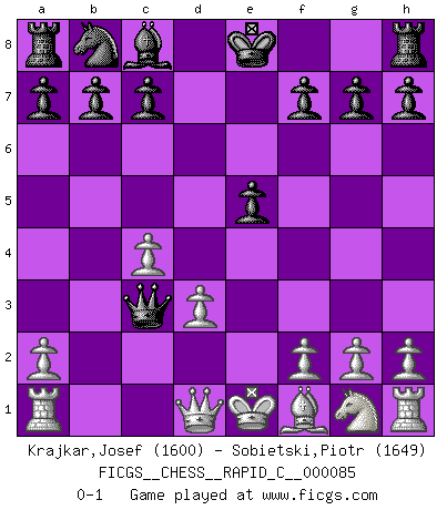 Last move : 0-1 2010 April 24 21:36:50 [Event "FICGS__CHESS__RAPID_C__000085"] [Site "FICGS"] [Date "2010.04.17"] [Round "1"] [White "Krajkar,Josef"] [Black "Sobietski,Piotr"] [Result "0-1"] [WhiteElo "1600"] [BlackElo "1649"] 1.e4 d5 2.Nc3 d4 3.Nd5 Nf6 4.d3 Nxd5 5.exd5 Qxd5 6.c4 dxc3 7.bxc3 e5 8.c4 Bb4+ 9.Bd2 Bxd2+ 10.Qxd2 Qd4 11.Qd1 Qc3+ 0-1 Scandinavian (centre counter) defense Player Black won this chess game. Follow this game move after move (download)My opponents make good moves too. Sometimes I don't take these things into consideration. (Bobby Fischer) Mit Schach schule ich mein Gefühl für Geometrie, was für Tennis und Schach gleichermaßen wichtig ist. (Boris Becker) En posiciones complicadas, Bobby Fischer pocas veces tuvo que temer de cualquiera. (Paul Keres) Les échecs sont utiles à l'exercice de la faculté de penser et à celle de l'imagination. Car nous devons posséder une méthode élaborée pour atteindre des buts partout où nous devons conduire notre raison. (Leibnitz) Lottery : A tax on people who are bad at math. (Author unknown)