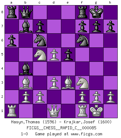 Last move : 1-0 2010 May 3 19:43:43 [Event "FICGS__CHESS__RAPID_C__000085"] [Site "FICGS"] [Date "2010.04.17"] [Round "1"] [White "Hasyn,Thomas"] [Black "Krajkar,Josef"] [Result "1-0"] [WhiteElo "1596"] [BlackElo "1600"] 1.e4 e5 2.Nf3 Nc6 3.Bb5 a6 4.Ba4 b5 5.Bb3 Nf6 6.O-O Bc5 7.a4 Bb7 8.d3 O-O 9.Nc3 bxa4 10.Nxa4 Bb4 11.Be3 d5 12.Nc5 Qb8 13.exd5 1-0 Ruy Lopez : Caro variation Kingside Castling by player White (move 6) Kingside Castling by player Black (move 8) Player White won this chess game. Follow this game move after move (download)Chess is a cold bath for the mind. (Sir John Simon) Ein Remis kann durch Wiederholung von drei Zügen oder durch einen schlechte Zug erreicht werden. (Savielly Grigorievitsch Tartakower) Debemos de asegurarnos de que el Ajedrez no se convierta en un lenguaje muerto, muy interesante, pero solo para un grupo muy pequeño. (Sytze Faber) Le temps de noter son nom sur la feuille de partie, j'étais déjà en zeitnot ! D'un modeste amateur apparié lors de la première ronde d'un open contre le grand-maître Azmaïparashvili. Without deviation from the norm, progress is not possible. (Frank Zappa)