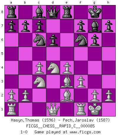 Last move : 1-0 2010 June 19 18:28:36 [Event "FICGS__CHESS__RAPID_C__000085"] [Site "FICGS"] [Date "2010.04.17"] [Round "1"] [White "Hasyn,Thomas"] [Black "Pech,Jaroslav"] [Result "1-0"] [WhiteElo "1596"] [BlackElo "1587"] 1.Nf3 Nf6 2.c4 g6 3.Nc3 Bg7 4.d4 O-O 5.e4 d6 6.Be2 e5 7.O-O Nc6 8.Be3 exd4 9.Nxd4 Re8 10.f3 1-0 Reti Opening Kingside Castling by player Black (move 4) Kingside Castling by player White (move 7) Player White won this chess game. Follow this game move after move (download)Spassky will not be psyched out by Fischer. (Mike Goodall) Computer sind die einzigen Gegner, die nicht immer eine Ausrede auf Lager haben, wenn sie gegen mich verlieren. (Robert James Fischer) Fischer es el jugador mas fuerte del mundo. De hecho, el jugador mas fuerte que jamas haya existido. (Larry Evans) Les échecs, c'est l'art d'analyser. (Mikhail Botvinnik) The difference between stupidity and genius is that genius has its limits. (Murphy)