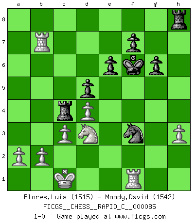 Last move : 1-0 2010 May 1 0:54:16 [Event "FICGS__CHESS__RAPID_C__000085"] [Site "FICGS"] [Date "2010.04.17"] [Round "1"] [White "Flores,Luis"] [Black "Moody,David"] [Result "1-0"] [WhiteElo "1515"] [BlackElo "1542"] 1.d4 Nf6 2.Bg5 Ne4 3.h4 c5 4.dxc5 Qa5+ 5.Nd2 Nxg5 6.hxg5 g6 7.c3 Qxc5 8.Ngf3 Bg7 9.e3 d6 10.Qb3 Qc7 11.O-O-O Be6 12.Bc4 Bxc4 13.Nxc4 Nd7 14.Rh4 h5 15.Re4 Nc5 16.Qb5+ Kf8 17.Rf4 a6 18.Qb6 Rc8 19.Qxc7 Rxc7 20.Nb6 Rc6 21.Rb4 e6 22.Nd4 Bxd4 23.exd4 Ne4 24.Nd7+ Kg7 25.Rxb7 Nxg5 26.Nb8 Rc4 27.Nxa6 Ra8 28.Nb4 d5 29.Re1 Kf6 30.f3 h4 31.Rh1 Rh8 32.Nd3 h3 33.gxh3 Nxf3 34.Rf1 1-0 Trompowsky attack (Ruth, Opovcensky Opening) Queenside Castling by player White (move 11) Player White won this chess game. Follow this game move after move (download)Fischer was a master of clarity and a king of artful positioning. His opponents would see where he was going but were powerless to stop him. (Bruce Pandolfini) Frage des Reporters: -Worin besteht das Ziel von Gambiteröffnungen? Antwort: -Auf Kosten der Partie einen Ruf als Angriffspieler zu erwerben.- (Siegbert Tarrasch) Prefiero perder una partida realmente buena, que ganar una mala. (David Levy) Toutes choses étant égales, c'est la conviction qui gagne. Alliée à une volonté de vaincre, elle sert de détonateur, suscite des idées, disperse les doutes et aide à penser clairement. (Robert Fischer) Information on the Internet is subject to the same rules and regulations as conversation at a bar. (George Lundberg)