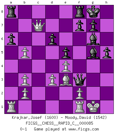 Last move : 0-1 2010 April 24 21:37:50 [Event "FICGS__CHESS__RAPID_C__000085"] [Site "FICGS"] [Date "2010.04.17"] [Round "1"] [White "Krajkar,Josef"] [Black "Moody,David"] [Result "0-1"] [WhiteElo "1600"] [BlackElo "1542"] 1.e4 e5 2.Nf3 Nc6 3.Bb5 a6 4.Ba4 Nf6 5.d3 d6 6.O-O Be7 7.Nc3 b5 8.Bb3 O-O 9.Nd5 Na5 10.Nxf6+ Bxf6 11.Bd2 Nxb3 12.axb3 Bg4 13.h3 Bh5 14.g4 Bg6 15.c4 Qd7 16.Be3 h5 17.g5 Be7 18.cxb5 Qxh3 19.Qc1 Qxf3 20.Qxc7 Bxg5 0-1 Ruy Lopez : Anderssen variation Kingside Castling by player White (move 6) Kingside Castling by player Black (move 8) Player Black won this chess game. Follow this game move after move (download)The older I grow, the more I value Pawns. (Keres) Die Jungen erwarten, dass Opa einfach umfällt. Dann aber kann Opa fünf Stunden lang Schach spielen und die jungen Gegner an die Wand drücken. (Viktor Kortschnoi) En manos de Fischer's, una diminuta ventaja teórica es tan buena como tener una Reina de ventaja. (Isaac Kashdan) Le joueur d'Echecs qui veut atteindre le top est obligé de développer son propre credo créatif. Alexeï Stepanovicth Souétine. Il est facile d'écrire des livres ! Ce qui est difficile, c'est de jouer ! (Alexeï Stepanovicth Souétine) Whoever said the pen is mightier than the sword obviously never encountered automatic weapons. (US General Douglas MacArthur)