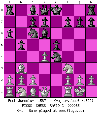 Last move : 0-1 2010 May 31 2:22:23 [Event "FICGS__CHESS__RAPID_C__000085"] [Site "FICGS"] [Date "2010.04.17"] [Round "1"] [White "Pech,Jaroslav"] [Black "Krajkar,Josef"] [Result "0-1"] [WhiteElo "1587"] [BlackElo "1600"] 1.e4 e5 2.Nf3 Nc6 3.Bb5 a6 4.Ba4 b5 5.Bb3 Nf6 6.O-O Nxe4 7.d4 Bd6 0-1 Ruy Lopez : Caro variation Kingside Castling by player White (move 6) Player Black won this chess game. Follow this game move after move (download)Combinations have always been the most intriguing aspect of Chess. The masters look for them, the public applauds them, the critics praise them. It is because combinations are possible that Chess is more than a lifeless mathematical exercise. They are the poetry of the game; they are to Chess what melody is to music. They represent the triumph of mind over matter. (Reuben Fine) Schach ist wie eine schöne Frau, zu der wir ständig zurückkehren, gleichviel, wie oft sie uns zurückweist. (Anonymous) Debemos de asegurarnos de que el Ajedrez no se convierta en un lenguaje muerto, muy interesante, pero tan solo para un grupo muy pequeño. (Sytze Faber) Les erreurs sont comme les malheurs, elles n'arrivent jamais seules. (Siegbert Tarrasch) Don't be irreplaceable, if you can't be replaced, you can't be promoted. (Dan Rotaru)