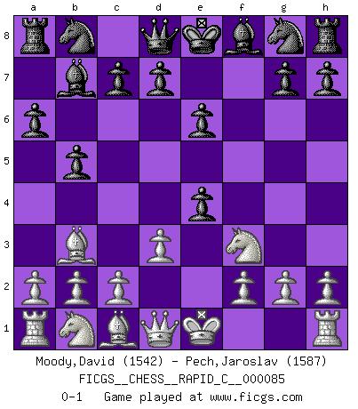 Last move : 0-1 2010 May 25 2:25:1 [Event "FICGS__CHESS__RAPID_C__000085"] [Site "FICGS"] [Date "2010.04.17"] [Round "1"] [White "Moody,David"] [Black "Pech,Jaroslav"] [Result "0-1"] [WhiteElo "1542"] [BlackElo "1587"] 1.e4 e6 2.Bb5 a6 3.Ba4 b5 4.Bb3 Bb7 5.d3 f5 6.Nf3 fxe4 0-1 French defense Player Black won this chess game. Follow this game move after move (download)There must have been a time when men were demigods, or they could not have invented Chess. (Gustav Schenk) Habe Mut, dich deines eigenen Verstandes zu bedienen. (Immanuel Kant) El Ajedrez, como cualquier actividad creativa, solo puede existir a través del esfuerzo combinado de aquellos que tienen talento creativo y de aquellos que poseen la habilidad de organizar su trabajo creativo. (Mikhail Botvinnik) Echiquier : carré parfait, comme la Jérusalem nouvelle décrite par l'auteur de l'Apocalypse, huit cases sur huit, exaltation du chiffre 4, symbole du cosmos aux quatre horizons... où le noir et le blanc, l'ombre et la lumière, le mal et le bien s'entremêlent et se conjuguent. (Robert Couffignal, Le Gambit du poète) The best teachers teach from the heart, not from the book. (Author unknown)