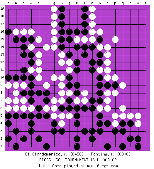 Last move : 1-0 2010 November 30 10:20:49 [Event "FICGS__GO__TOURNAMENT_KYU__000102"] [Site "FICGS"] [Date "2010.04.18"] [Round "1"] [Black "Di Giandomenico,Alfonso"] [White "Ponting,Andrew"] [Result "1-0"] [Rating 1 "0458"] [Rating 2 "0000"] 1.d4 p15 2.q4 e15 3.k4 q5 4.r4 q6 5.d10 e10 6.d9 e11 7.f8 g10 8.h6 h8 9.n7 o6 10.n5 p5 11.o4 o7 12.o9 o8 13.n8 o10 14.p9 q9 15.n10 p10 16.n9 p8 17.j9 h9 18.j10 h10 19.j13 h13 20.n13 o13 21.n12 o12 22.d13 j11 23.k11 j12 24.k12 k13 25.l13 j14 26.m14 m15 27.k14 n14 28.d15 k15 29.j13 l15 30.l14 n11 31.m11 j8 32.k8 n6 33.m6 k7 34.k9 o11 35.m12 l7 36.m7 f9 37.e8 e13 38.d12 d16 39.c15 b16 40.b15 m1 41.m2 p4 42.h14 h12 43.j15 g14 44.h15 g15 45.n15 o14 46.k16 n16 47.l16 m16 48.j16 g16 49.h17 g17 50.h18 g18 51.h19 m17 52.l17 m18 53.l18 m19 54.l19 c16 55.j7 l2 56.l3 n2 57.m3 n1 58.k2 l1 59.k1 o3 60.n4 d14 61.c14 f14 62.p3 p2 63.q3 q2 64.r2 r1 65.s2 s5 66.n3 o2 67.s1 s4 68.q1 p1 69.o1 h7 70.j6 g7 71.f7 g6 72.f5 g5 73.g4 h5 74.k5 j5 75.k6 f6 76.e6 h4 77.g3 d11 78.c11 l8 79.l6 c3 80.d3 c4 81.c5 c6 82.d5 d6 83.e5 b6 84.b5 b8 85.c10 e12 86.c13 g19 87.h16 r5 88.h3 b4 89.a4 a3 90.a5 d2 91.e2 e1 92.f1 d1 93.c2 c1 94.b1 b2 95.b3 a1 96.a2 b9 97.b10 a6 98.a10 a9 99.c8 c7 100.d7 c9 101.d8 b7 102.a8 a7 103.a16 1-0 This go game has been lost on time (started : 2010.04.18 0:27:18) Here are the names of the openings (joseki) played in the four corners : Corner q4 : q4 q5 Hoshi (Hwajeom, Seongjeom, Xingwei`) 4-4 Point. The star or hoshi (4-4) point, emphasizing influence at the potential expense of territory. Corner q16 : p15 n13 Go-no-go (Wu~wu~) 5-5 Point. The 5-5 was experimented with briefly during the "New Fuseki" movement in Japan in the 1930s. The 5-5 point has not retained popularity because the 4-4 hoshi (star) point strikes a better balance between influence and territory. As one can see from the variations, though, the 5-5 is playable. Player Black won this Go (weiqi, baduk) game. Follow this game move after move (download)In an unreasonable situation, an unreasonable move is reasonable. (Tamino) Wisdom begins at the end. (Daniel Webster)
