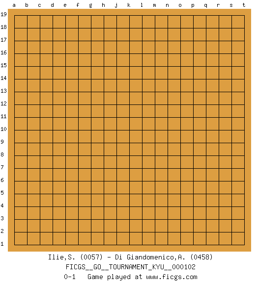 Last move : 0-1 2010 May 20 20:25:55 [Event "FICGS__GO__TOURNAMENT_KYU__000102"] [Site "FICGS"] [Date "2010.04.18"] [Round "1"] [Black "Ilie,Sebastian"] [White "Di Giandomenico,Alfonso"] [Result "0-1"] [Rating 1 "0057"] [Rating 2 "0458"] 0-1 This go game has been lost on time (started : 2010.04.18 0:27:18) Here are the names of the openings (joseki) played in the four corners : Player White won this Go (weiqi, baduk) game. Follow this game move after move (download)Eyes win semiais. (Anonymous) It is not titles that honor men, but men that honor titles. (Niccolo Machiavelli)