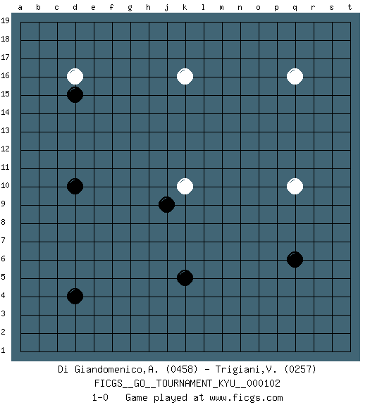 Last move : 1-0 2010 May 30 8:48:23 [Event "FICGS__GO__TOURNAMENT_KYU__000102"] [Site "FICGS"] [Date "2010.04.18"] [Round "1"] [Black "Di Giandomenico,Alfonso"] [White "Trigiani,Vincenzo"] [Result "1-0"] [Rating 1 "0458"] [Rating 2 "0257"] 1.d4 q16 2.k5 k10 3.q6 q10 4.d10 d16 5.j9 k16 6.d15 1-0 This go game has been lost on time (started : 2010.04.18 0:27:18) Here are the names of the openings (joseki) played in the four corners : Corner d16 : d16 d15 Hoshi (Hwajeom, Seongjeom, Xingwei`) 4-4 Point. The star or hoshi (4-4) point, emphasizing influence at the potential expense of territory. Player Black won this Go (weiqi, baduk) game. Follow this game move after move (download)It is difficult to know exactly what you are doing. (Pierre Audouard) Convictions are more dangerous enemies of truth than lies. (Friedrich Nietzsche)