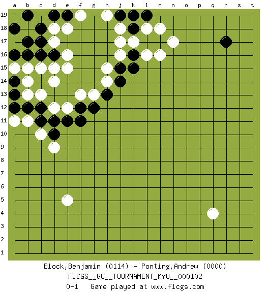 Last move : 0-1 2010 July 23 14:22:22 [Event "FICGS__GO__TOURNAMENT_KYU__000102"] [Site "FICGS"] [Date "2010.04.18"] [Round "1"] [Black "Block,Benjamin"] [White "Ponting,Andrew"] [Result "0-1"] [Rating 1 "0114"] [Rating 2 "0000"] 1.r17 e16 2.c17 d17 3.c16 c15 4.c18 d18 5.b16 b15 6.b17 d15 7.d19 e18 8.e19 f19 9.b19 n17 10.a18 q4 11.a16 a15 12.d16 e15 13.a14 b13 14.a12 a11 15.b12 c13 16.a13 b11 17.c12 d12 18.c11 c10 19.c14 b14 20.d11 d14 21.e11 e12 22.f11 e5 23.d10 d9 24.f12 f13 25.g12 g13 26.h13 h14 27.j14 h15 28.j15 j16 29.k16 k17 30.l17 l16 31.k15 l18 32.m17 m16 33.k18 j17 34.l19 m18 35.k19 j18 36.j19 h19 0-1 Here are the names of the openings (joseki) played in the four corners : Corner d16 : e16 c17 Takamoku (Gomok, Gaomu`) 5-4 Point. The takamoku (high) point (5-4). With its emphasis on influence, the 5-4 point complements the 4-4 (hoshi) point in creating an influence-oriented fuseki. San-san. Black plays the 3-3 when White has a stone at top such as marked. Corner q16 : r17 n17 San-San (Sam-Sam, San-San) 3-3 Point. The San-San (3-3) point, emphasizing territory at the expense of influence. Player White won this Go (weiqi, baduk) game. Follow this game move after move (download)A basic: Don't push too hard. (Jansteen) It's not the size of the dog in the fight, it's the size of the fight in the dog. (Mark Twain)